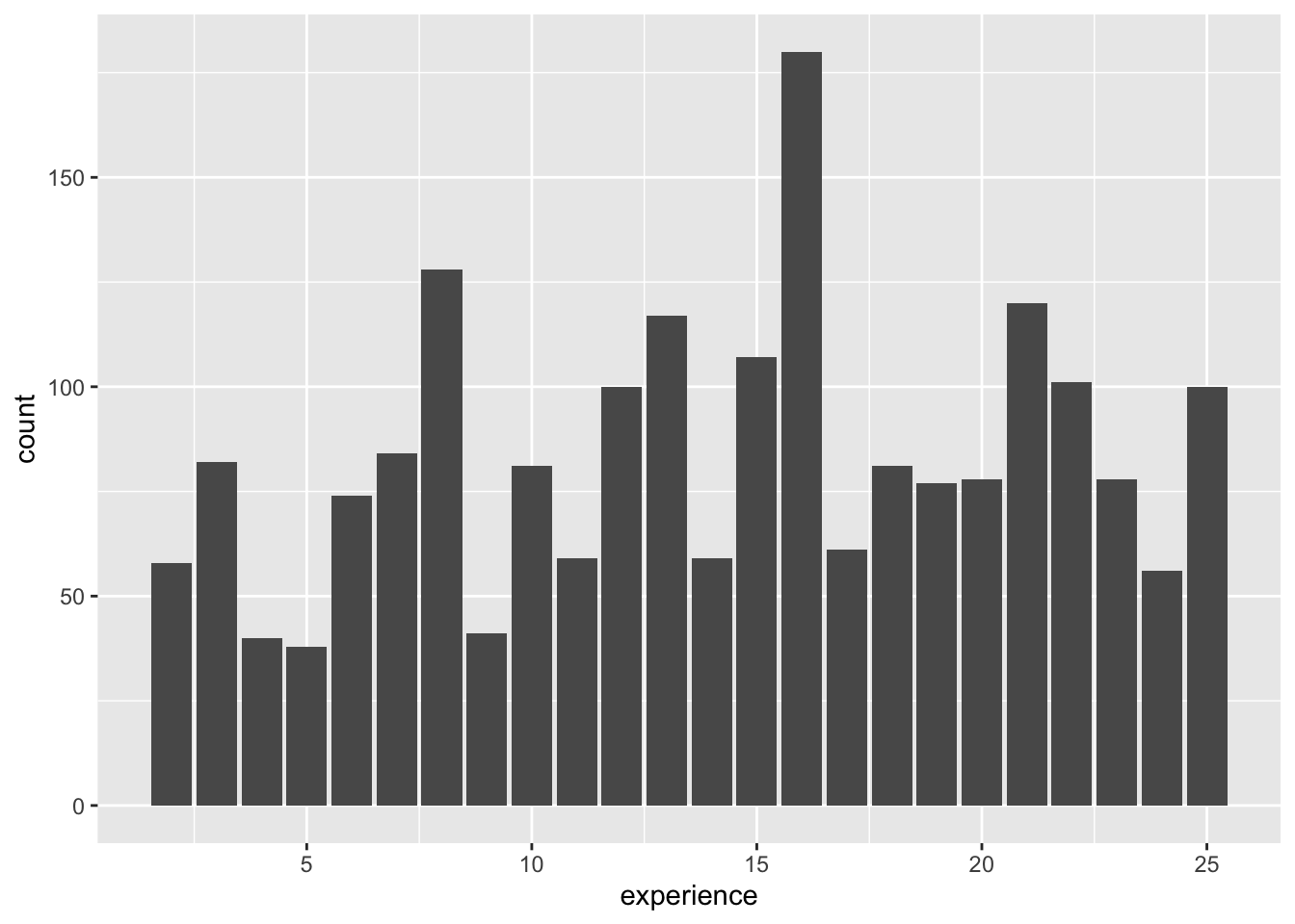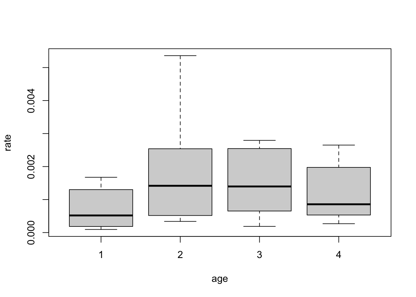 Firstly, we observe from the fitted model summary that the absolute t-value for the squared age coefficient is approximately \(18 \gg 2\). Then, we see that the LR test gives a chi-square statistic of \(170.47\) at 1df, which is higher than any reasonable quantile of that distribution. Finally, the \(95\%\) confidence interval for c(age^2) clearly does not contain \(0\). Thus, there is very strong evidence to include the quadratic term.