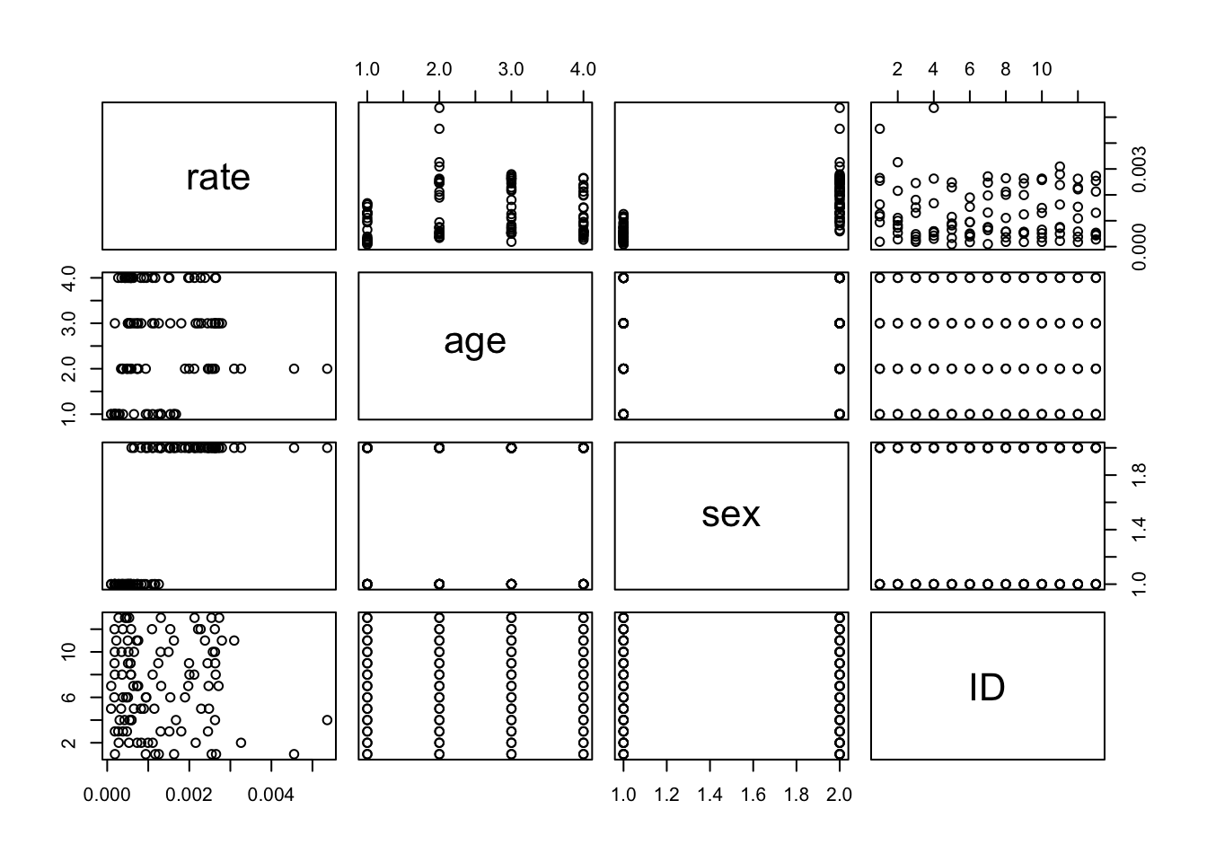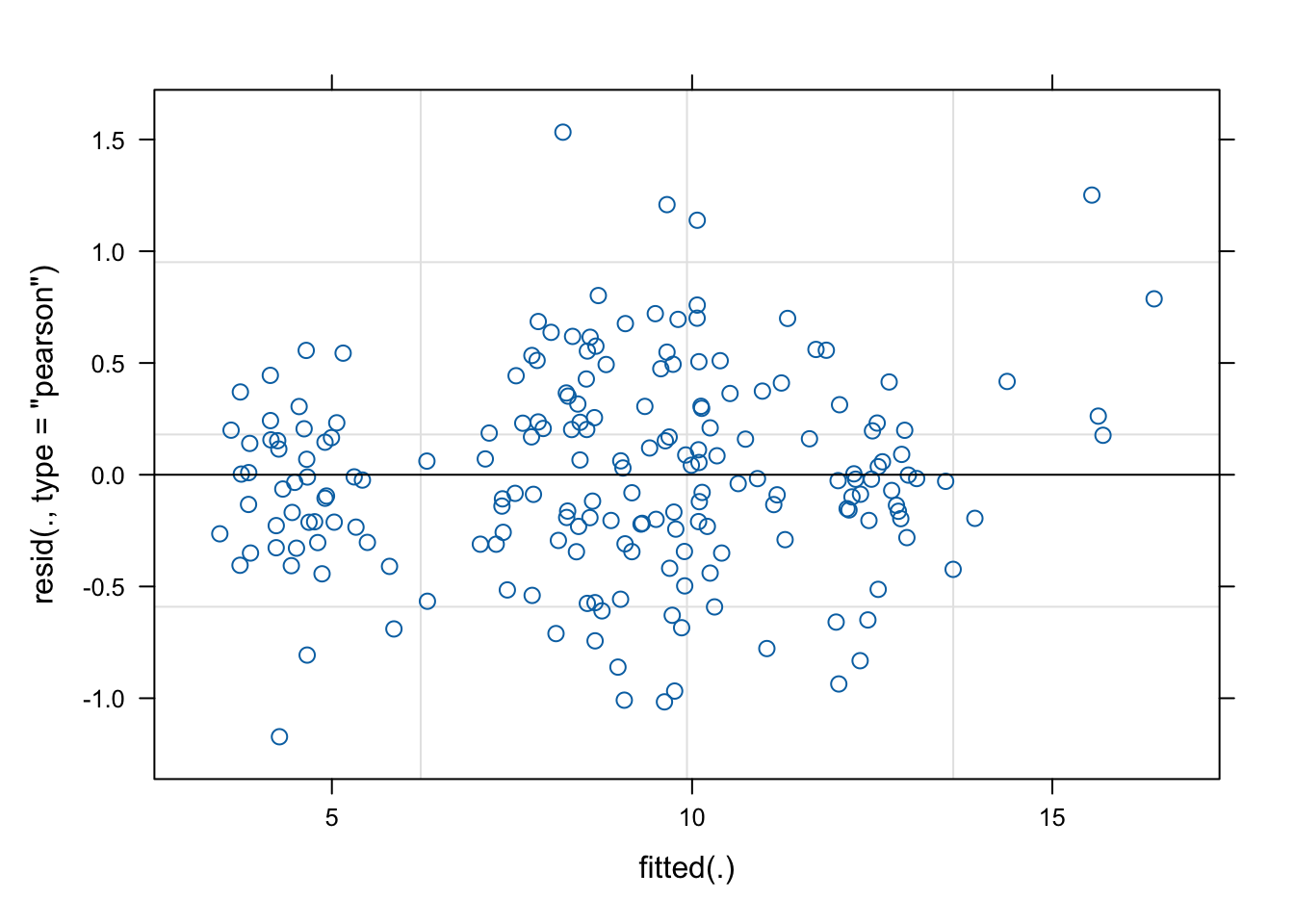 This does not look great, but on the other hand, the normality of the random effects is rather a technical assumption than a modelling assumption. Hence, less perfection of adherence to this assumption is expected as compared to the residual plot.