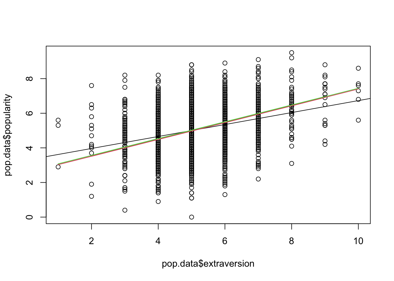 We see that there are some differences in the variance components (that is, in the standard deviations and correlations given under Random effects), and some smaller differences for the fixed effects (this is commonly so). We also see that the ML version gives some additional outputs (log-likelihood, BIC, etc.). These values are not well defined under REML, and hence not given.