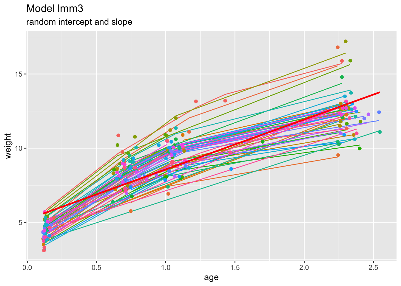 ggtitle("Model lmm3", subtitle="random intercept and slope") +