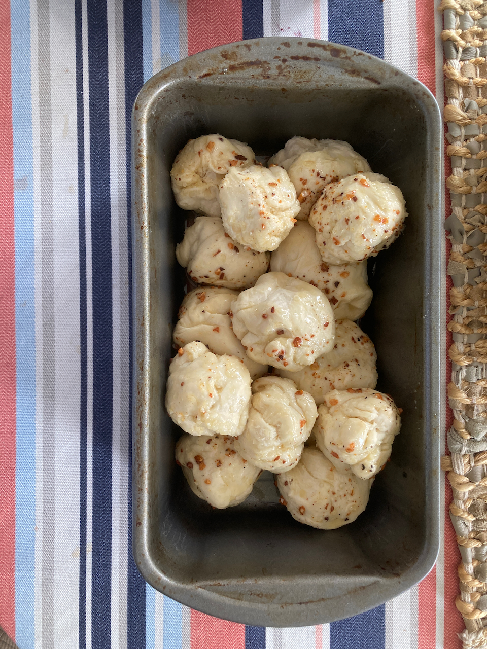 - Lightly oil a standard bread loaf pan. Roll each ball of dough in the garlic/butter mix and stack in the loaf pan.