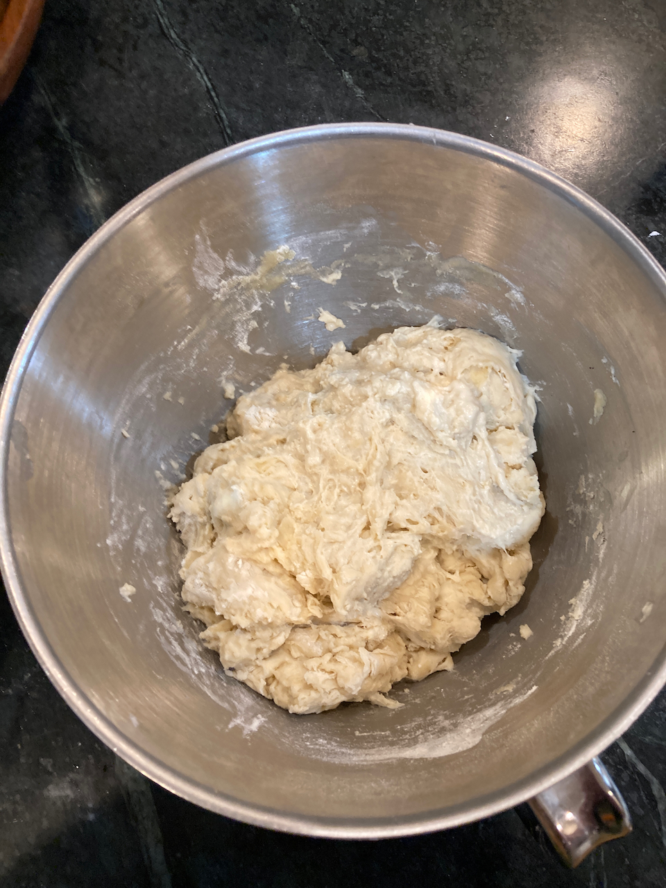 - Combine leaven, poolish, water, and both flours in bowl of stand mixer. Mix with paddle attachment at low speed until all of the flour is hydrated (~1 minute). Cover with cloth and let stand 30-60 minutes.