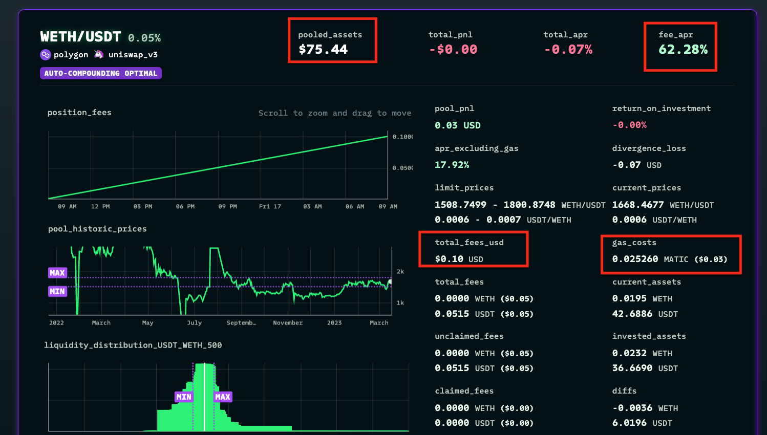 pooled_assetsshows the current USD value of the liquidity provided.total_fees_usdshows the current USD value of all fees earned by the position.fee_aprshows the annualized rate of return from fees alone.gas_costsshows the total amount of gas spent from adding, increasing, and removing liquidity and collecting fees.