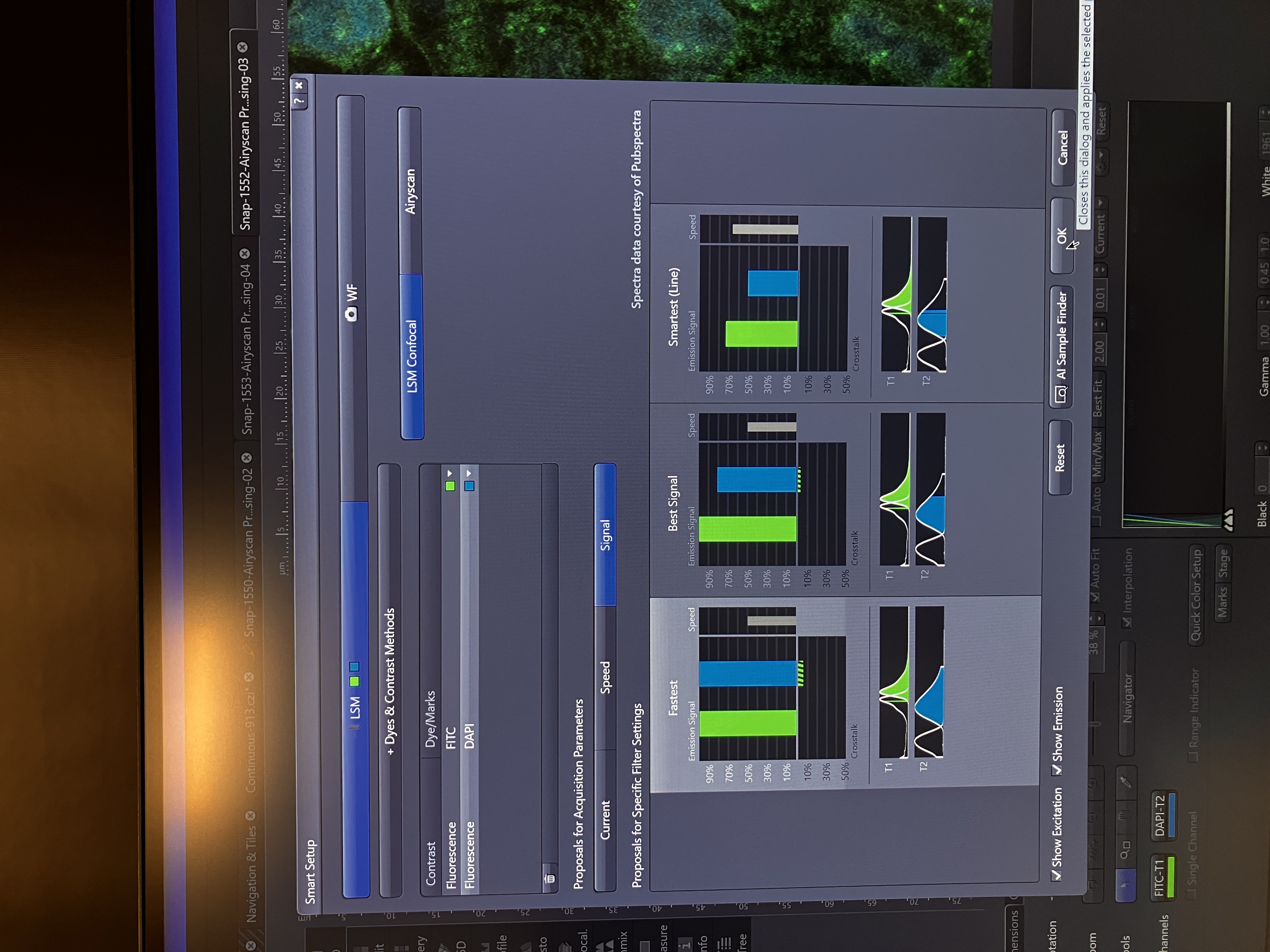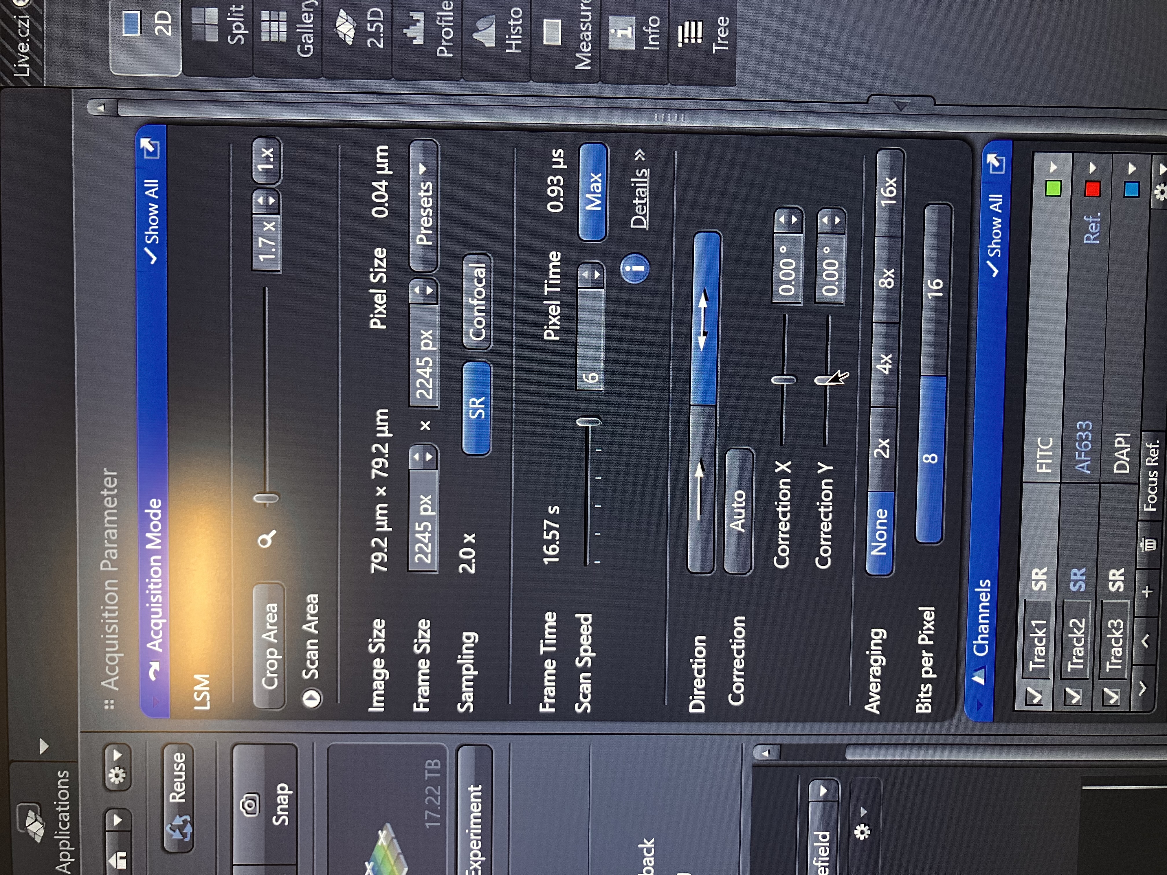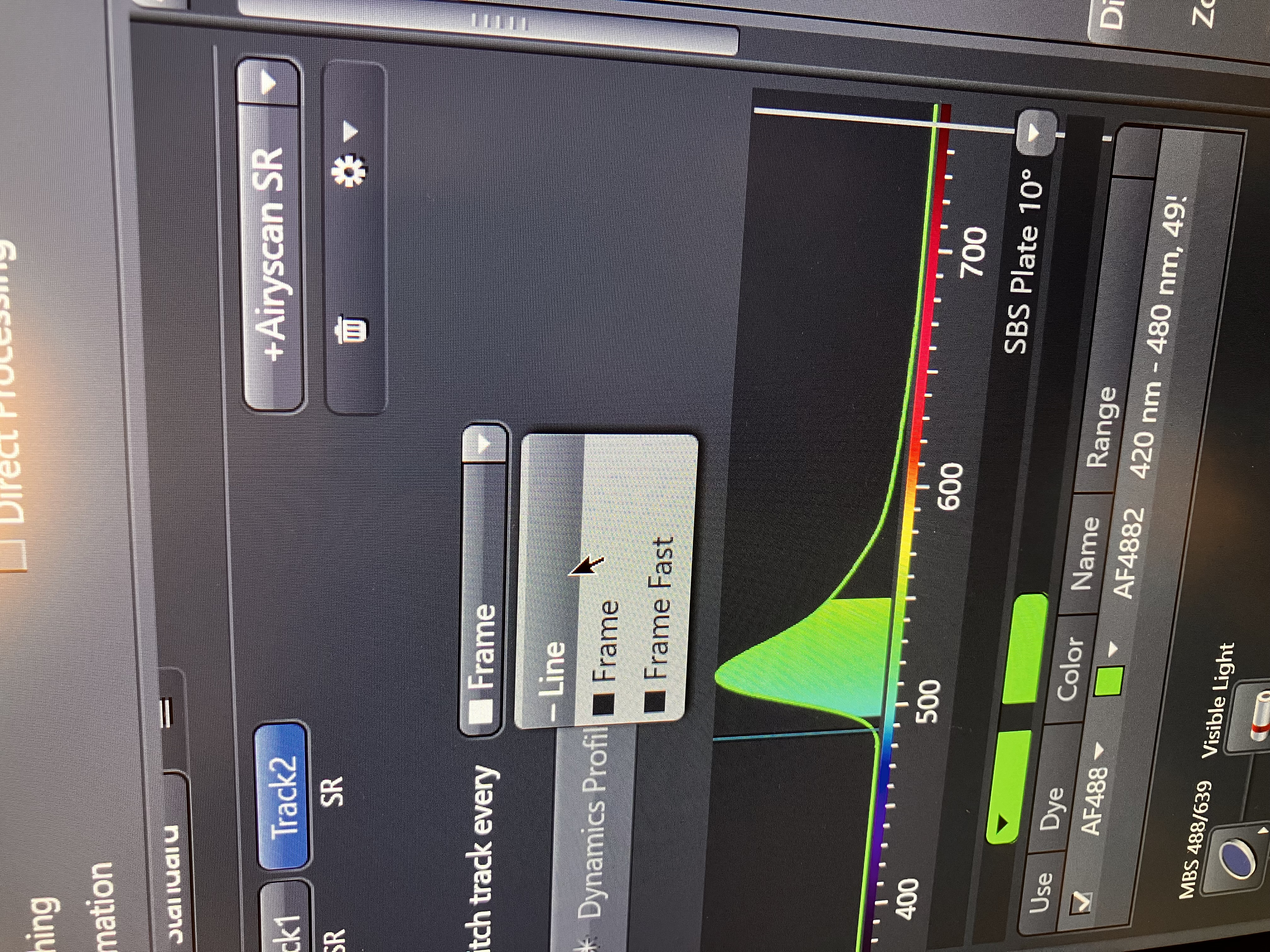 Note that any time Airyscan is used, it is implied that sequential acquisition takes place. This means that light from each track is imaged one track after the next, since each track requires its own Airyscan alignment. Thus, the Airyscan imaging process can be slow if one does not set up an acquisition scheme that is logical.