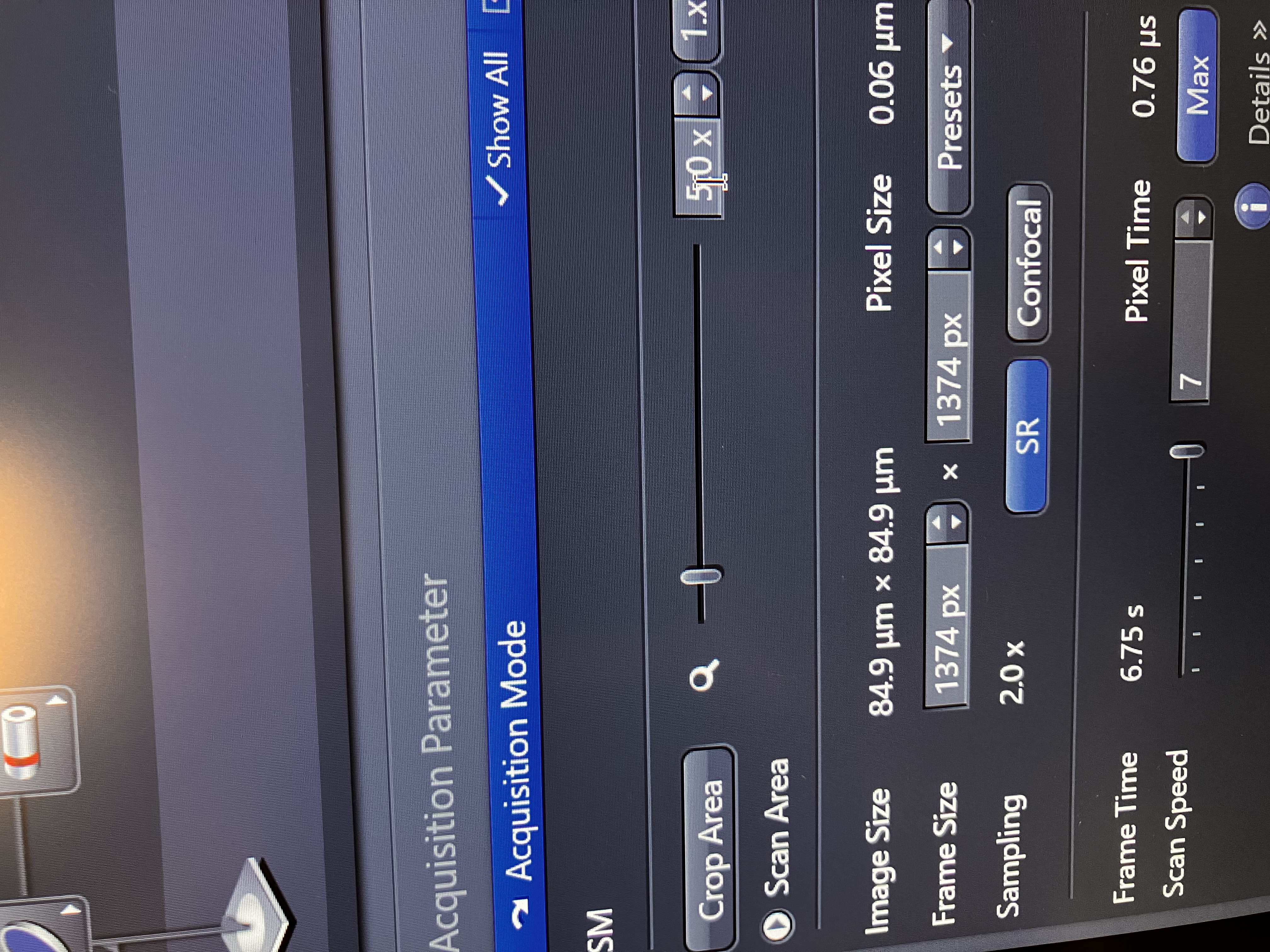 - Crop area refers to the field of view. By default, it is set to 1.7x. However, you can increase this number to crop the field of view. Frame size refers to the number of pixels that will comprise the image. In “Live” mode, this is set to 512 x 512. “Continuous” mode uses the parameter that you set here. The “SR” button will ensure that your sampling is adequate for SR-level resolution.