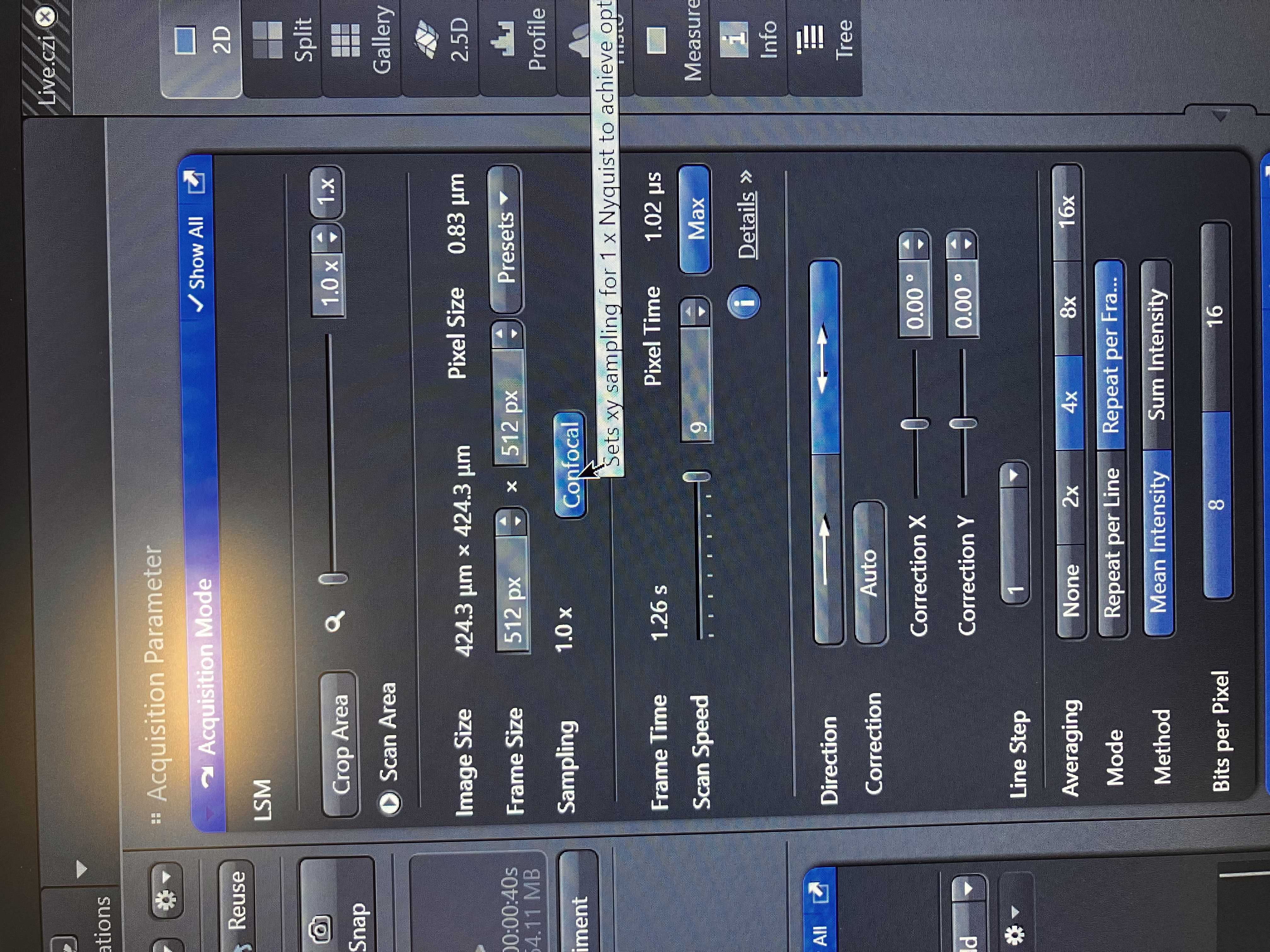 - Crop area refers to the field of view. By default, it is set to 1x. However, you can increase this number to crop the field of view. Frame size refers to the number of pixels that will comprise the image. In “Live” mode, this is set to 512 x 512. “Continuous” mode uses the parameter that you set here. The “Confocal” button ensures that the sampling will achieve Confocal-level resolution.