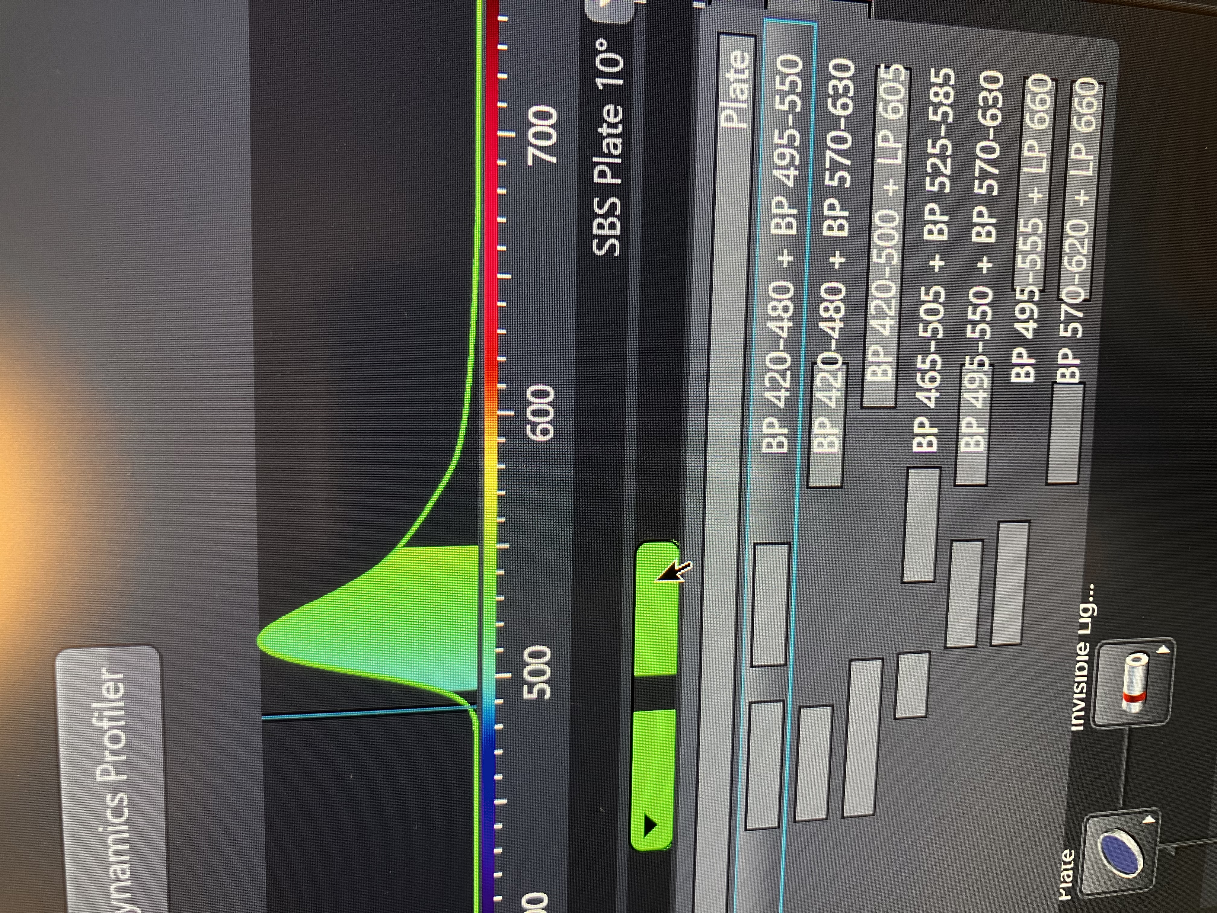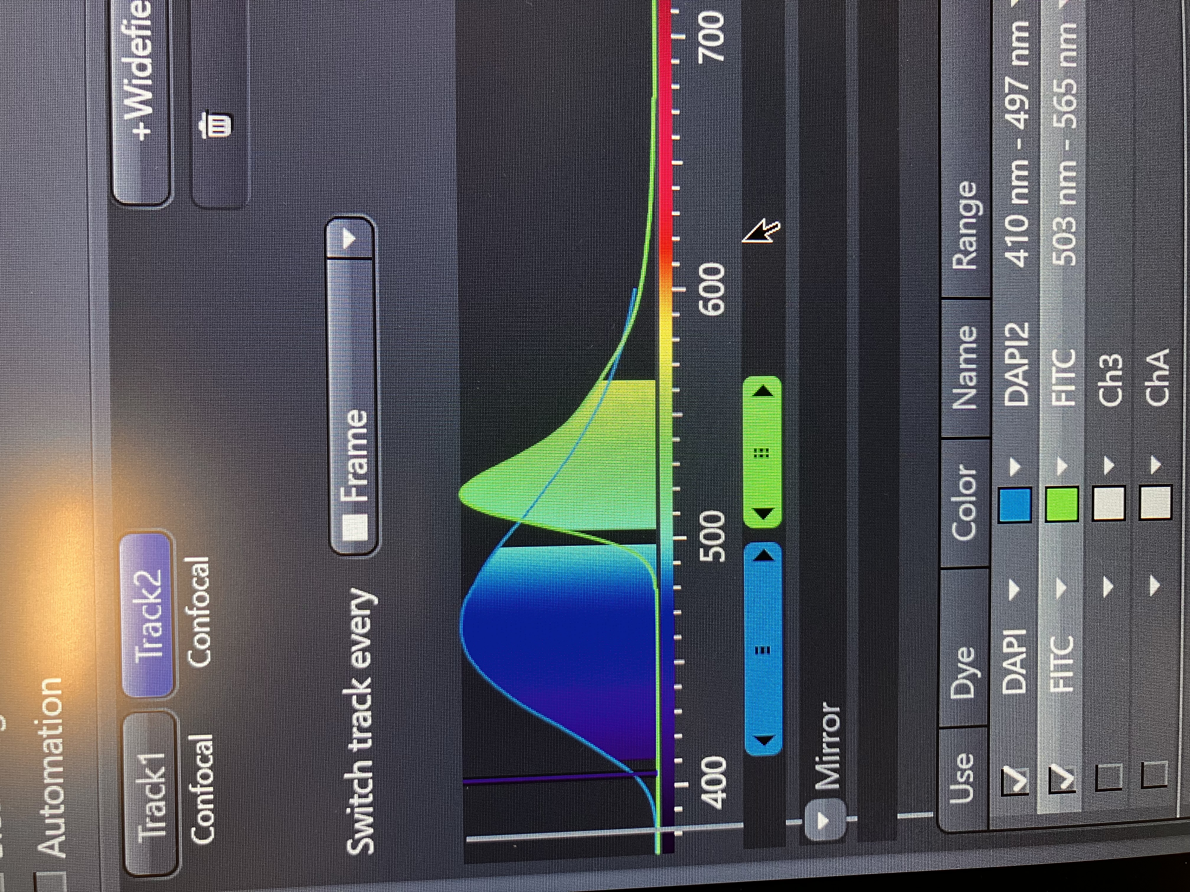 - As mentioned above, you can perform simultaneous acquisition in confocal mode. Within a track, you can add multiple dyes and adjust the corresponding filters accordingly: