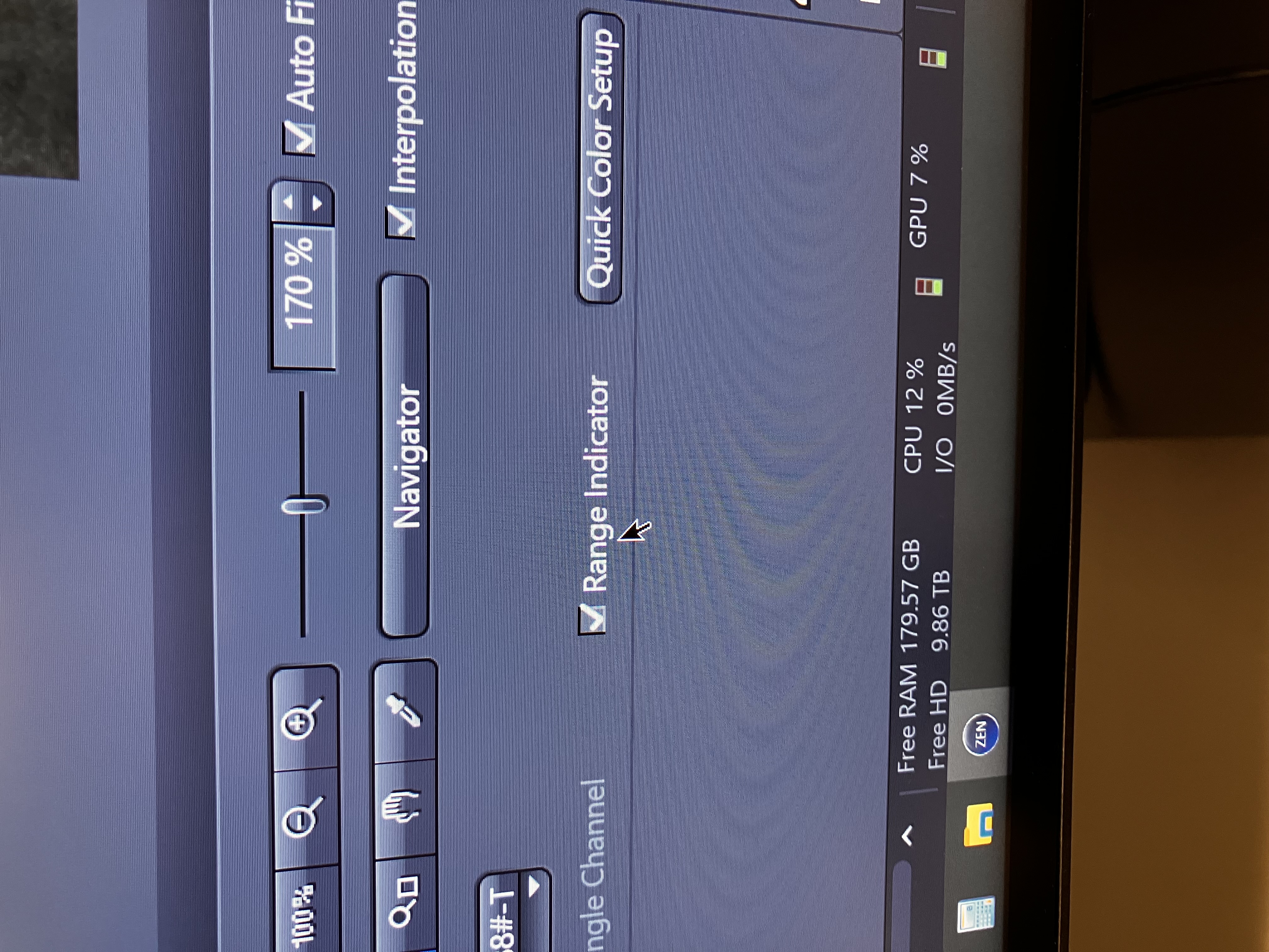 - Check the range indicator for any saturated pixels. There should be no saturated pixels at all. Saturated pixels display as red. Having saturated pixels can negatively affect deconvolution methods in processing steps downstream.