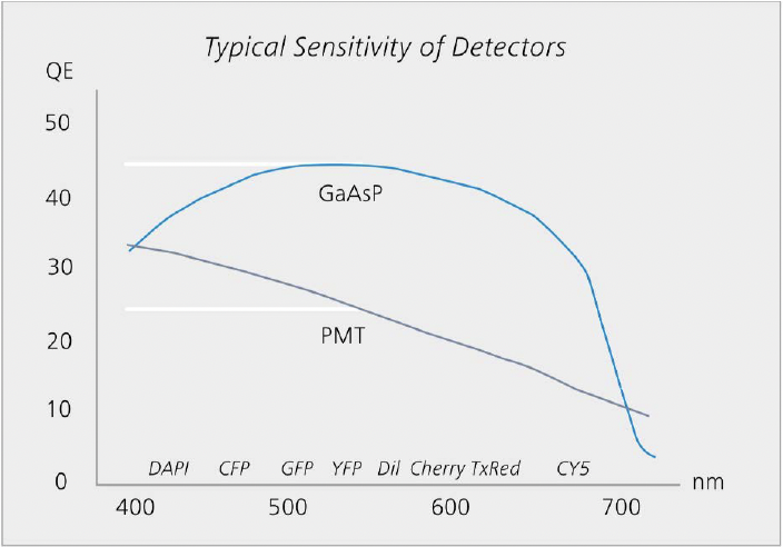 In confocal mode, you can specify which detector is used for each track. Our setup has three detectors: Multialkali-PMTs (assigned to channels 1 and 3), a GaAsP-PMT (assigned to channel 2), and the Airyscan detector (assigned to channel 4). The ladder two are more sensitive, so take fact that into consideration, using this plot: