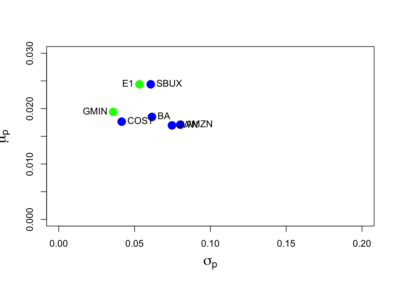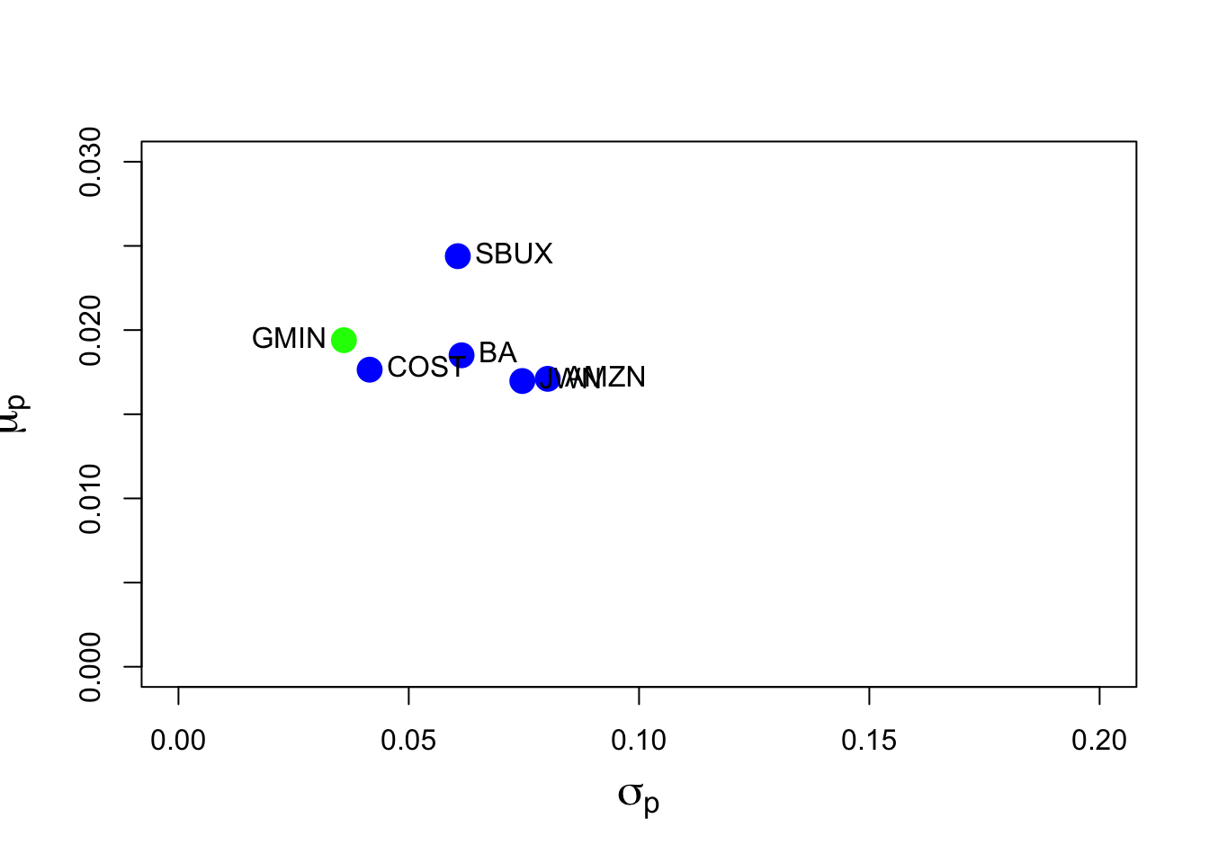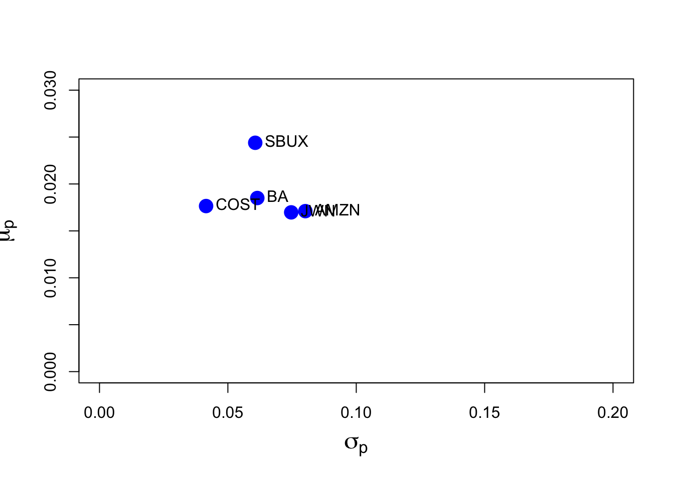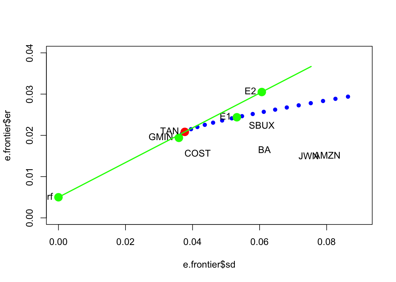 This portfolio has negative weights in AMZN and JWN (just like the global minimum variance portfolio) and the highest weight in SBUX. The mean is the same as SBUX, but its volatility is smaller at \(0.0532\) compared with the volatility of SBUX at \(0.061\).