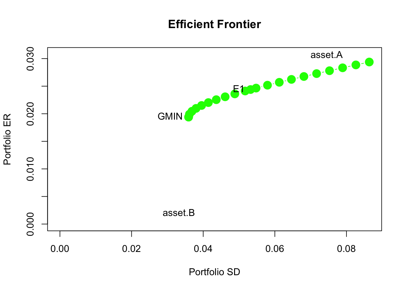 Here, we use the IntroCompFinR function efficient.frontier()