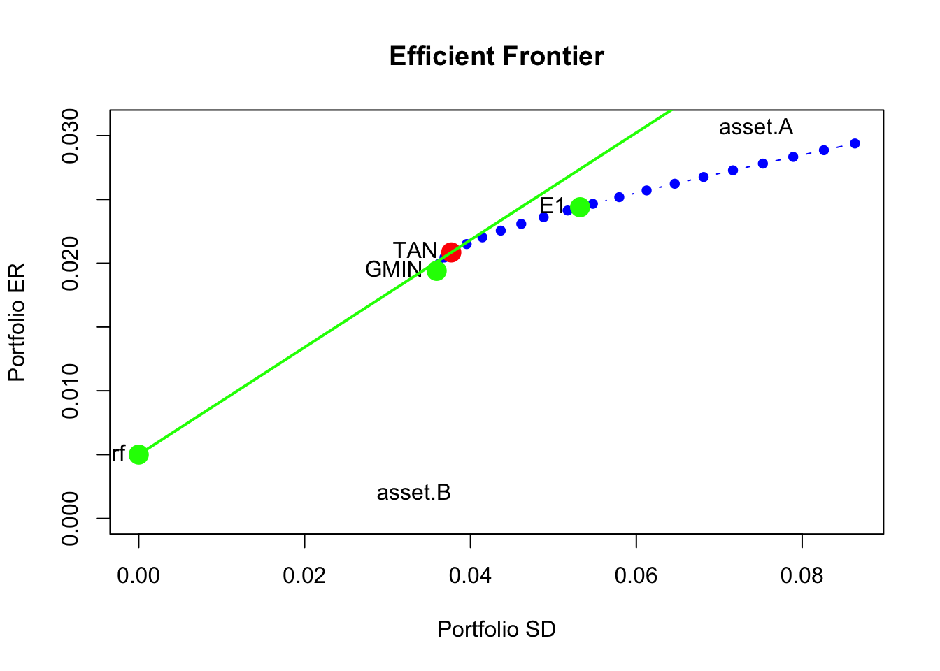 Now consider portfolios of a risky asset (e.g., asset A) and a risk-free asset (e.g., U.S. T-Bill) with risk-free rate \(r_{f}>0\). Let \(x\) denote the portfolio weight in the risky asset. Then \(1-x\) gives the weight in the risk-free asset. From Chapter 11, the expected return and volatility of portfolios of one risky asset and one risk-free asset are: \[\begin{eqnarray*} \mu_{p} & = & r_{f}+x(\mu-r_{f}),\\ \sigma_{p} & = & |x|\sigma, \end{eqnarray*}\] where \(\mu\) and \(\sigma\) are the expected return and volatility of the risky asset, respectively. For example, Figure 13.3 shows 29 portfolios of asset A and the risk-free asset with \(r_{f}=0.03\) created with: