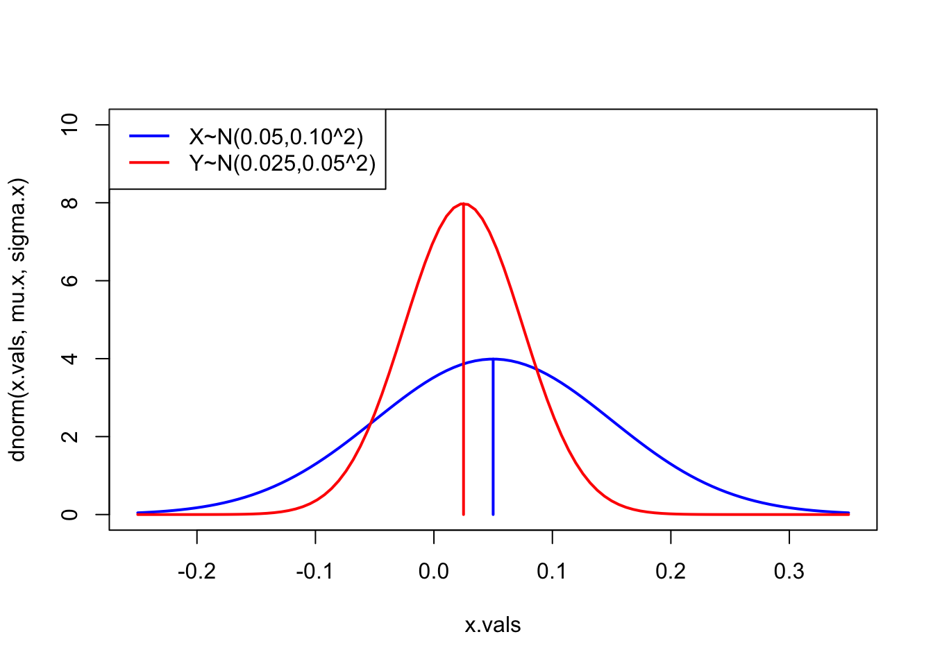 - Determine the \(1\%\) and \(5\%\) value-at-risk (VaR) over the year on the investment. Hint: to answer this question, you must determine the normal distribution that applies to the annual (12 month) continuously compounded return. This was done as an example in class.