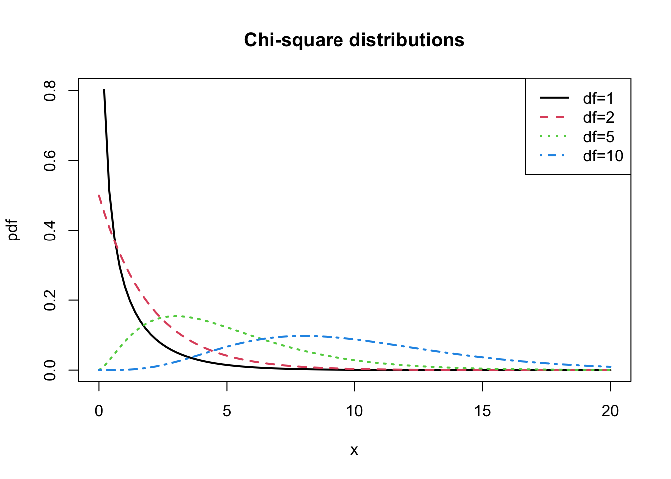A chi-square random variable with v degrees of freedom is defined as the sum of \(v\) squared independent standard normal random variables \(X = Z_{1}^{2} + Z_{2}^{2} + \cdots + Z_{v}^{2}\). The following shows a plot of the chi-square pdf for different values of \(v\).