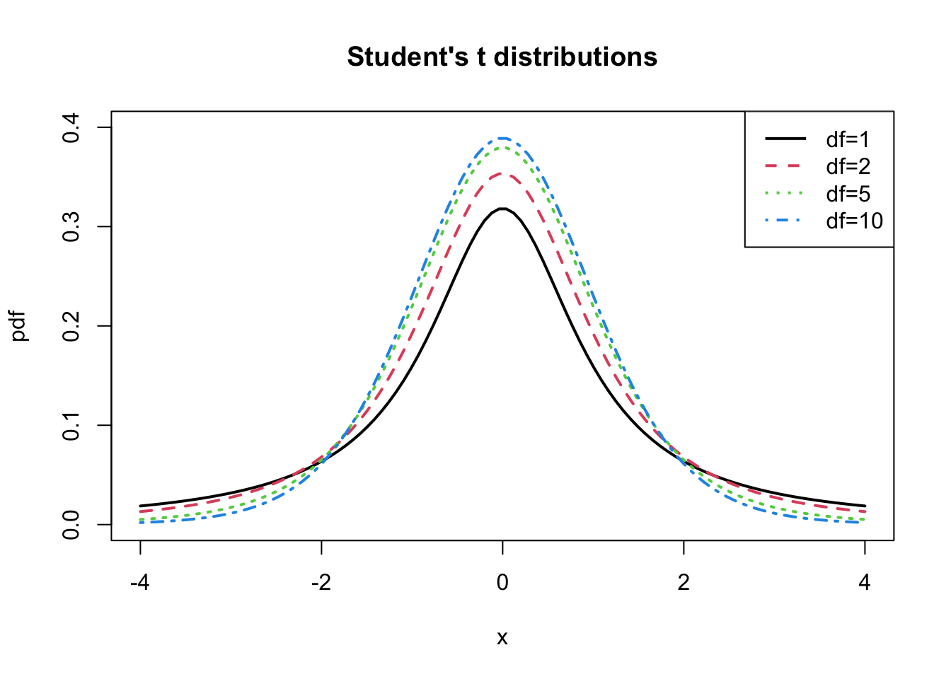 \[ Y = \frac{Z}{\sqrt{X/4}}, Z \sim N(0,1), X \sim \chi_{v}^{2} \] where \(Z\) is independent of \(X\). following shows a plot of the Student’s t pdf for different values of \(v\).