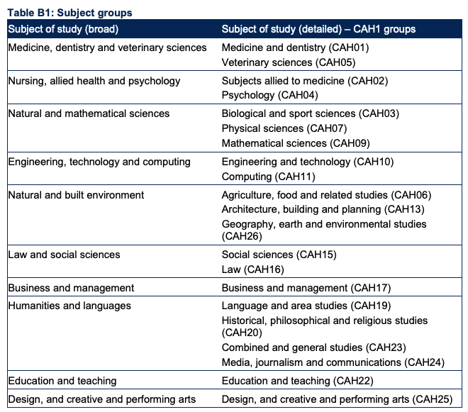 The OfS groups detailed subjects into broad subject areas according to the table below:
