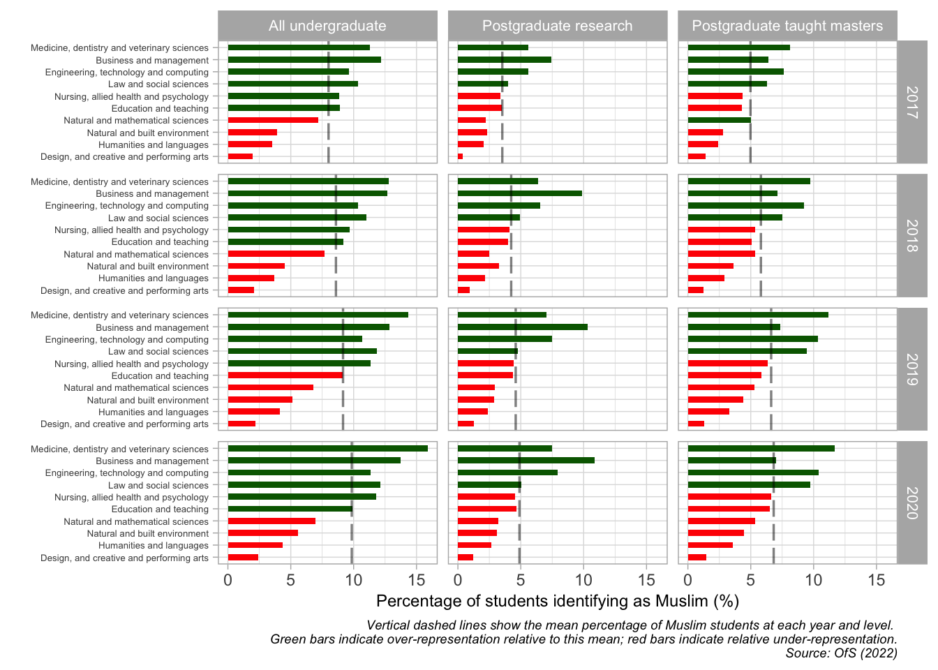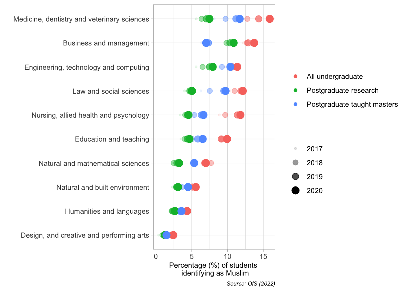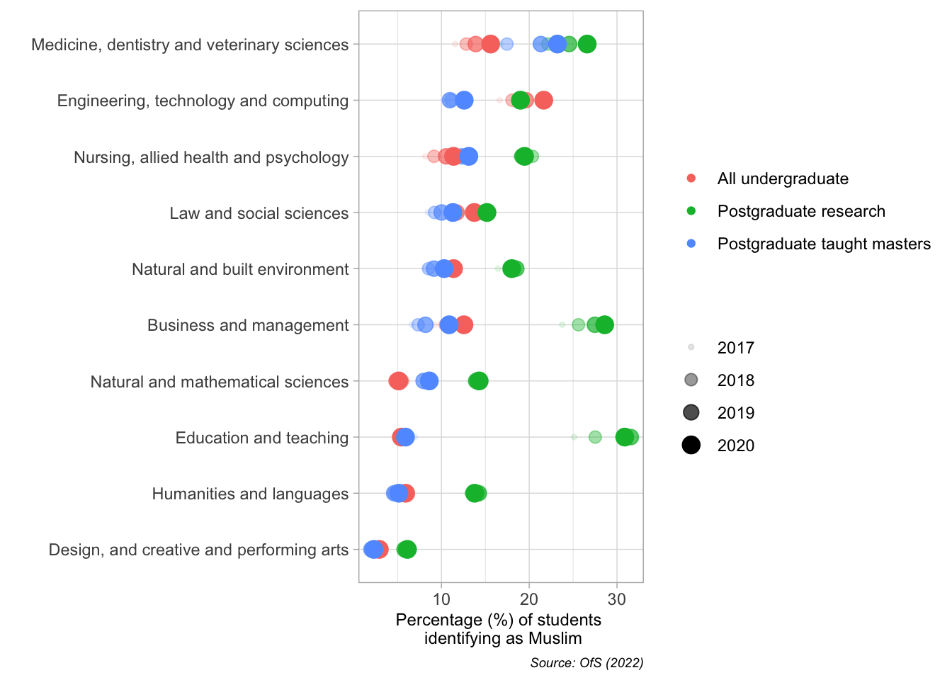 The percentage, henceforth representation, of Muslims is decreasing in the level of education, across all subject areas amongst UK domiciled students. For example, amongst UK domiciled students studying Medicine, dentistry and veterinary sciences, the ratio of Muslim representation amongst undergraduates, to postgraduate taught masters students, to postgraduate research students is approximately 3:2:1