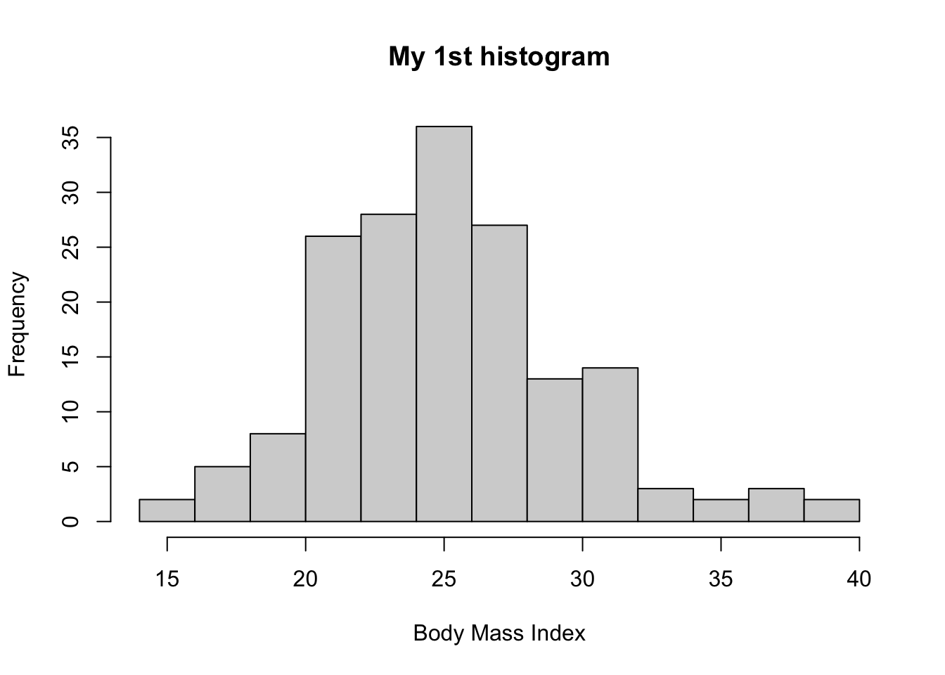We will start with basic functions. Let’s produce the histogram of the variable bmi created in task 1