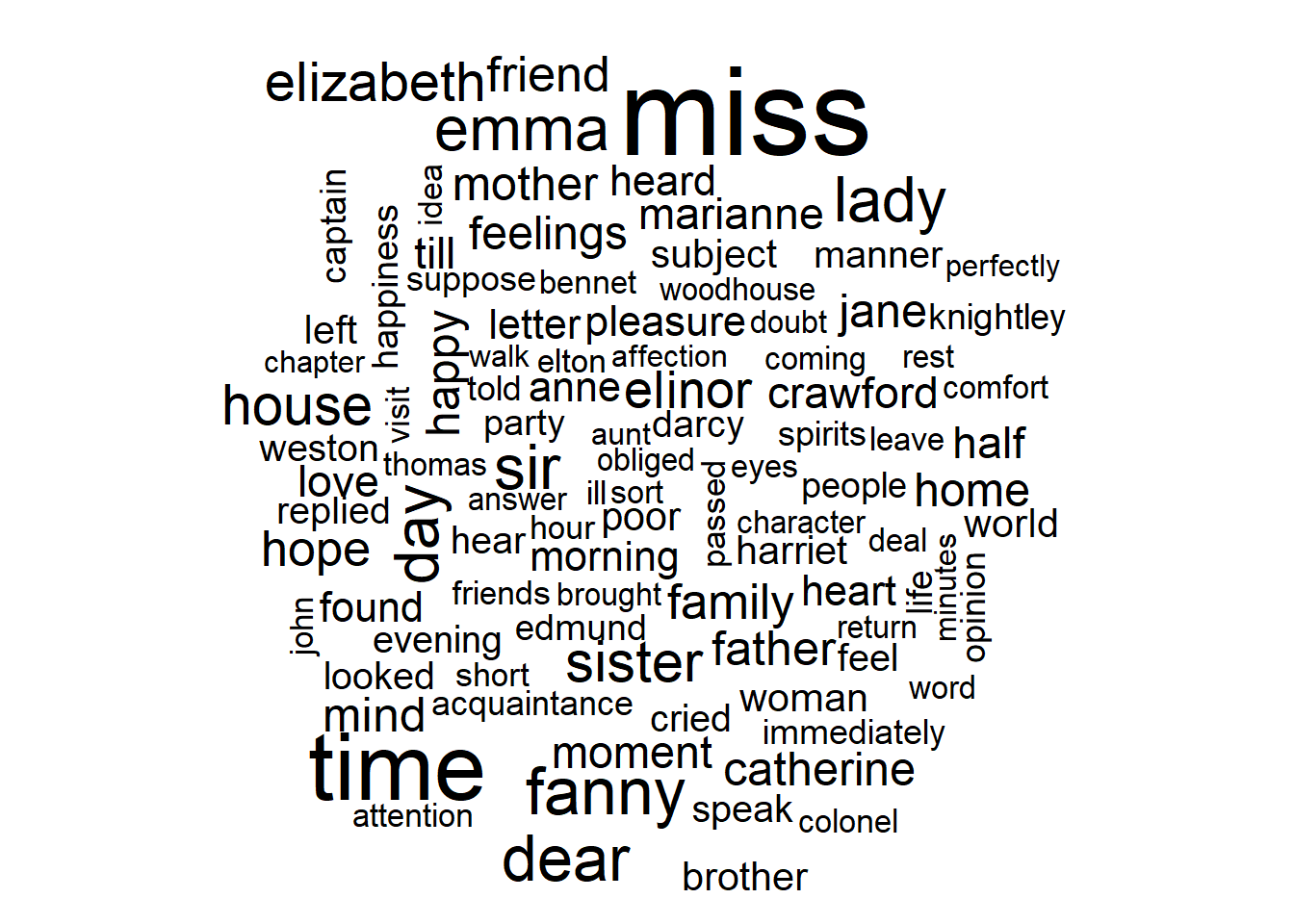 with(wordcloud(word, n, max.words = 100)) #限定词云的最大数量为100## Joining with `by = join_by(word)`
