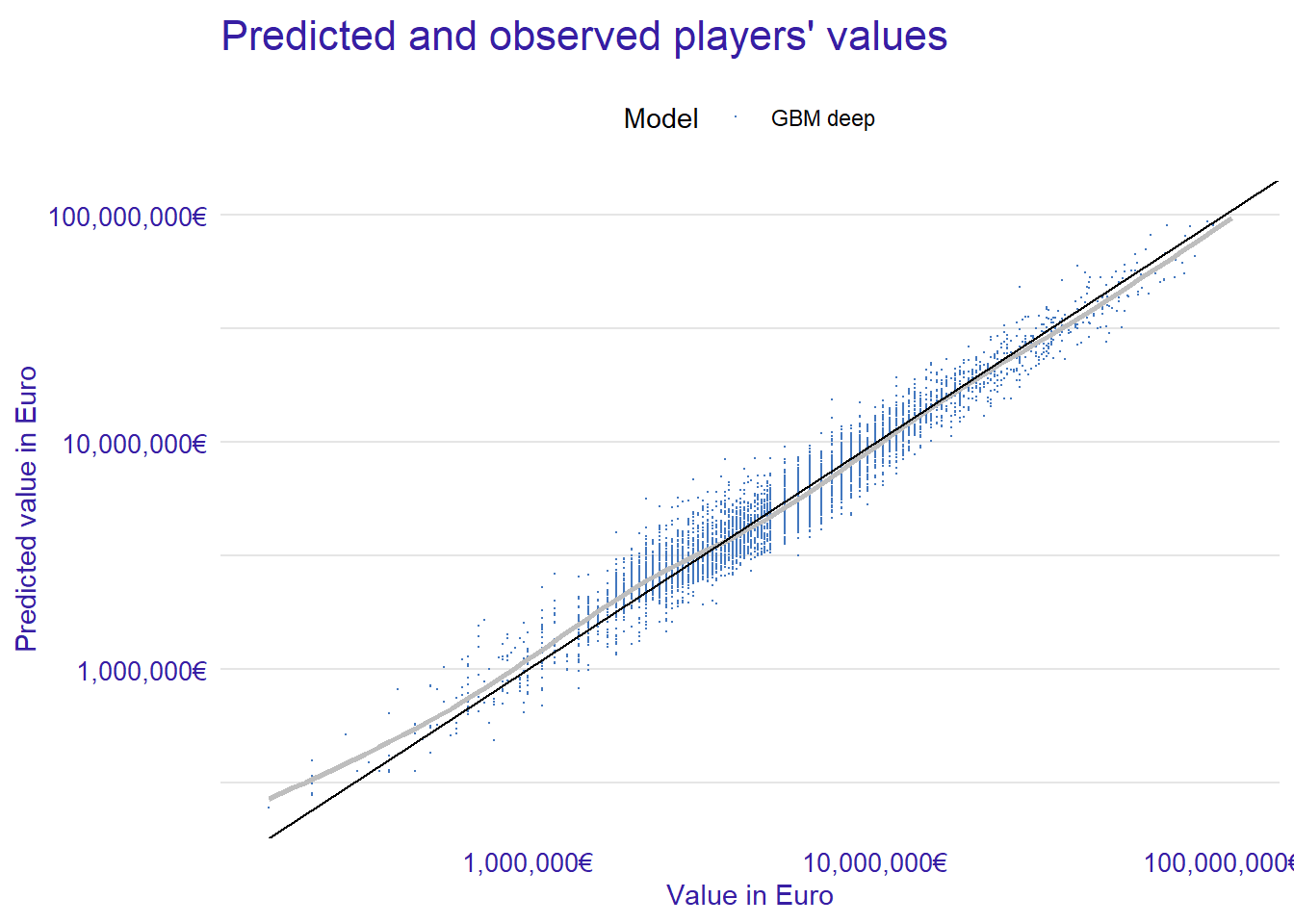 ggtitle("Predicted and observed players' values", "") ## `geom_smooth()` using method = 'gam' and formula = 'y ~ s(x, bs = "cs")'