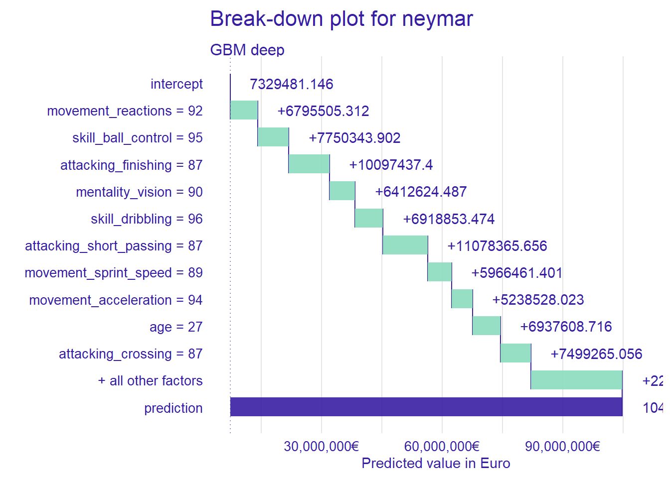 ggtitle("Break-down plot for neymar","") ## Scale for y is already present.