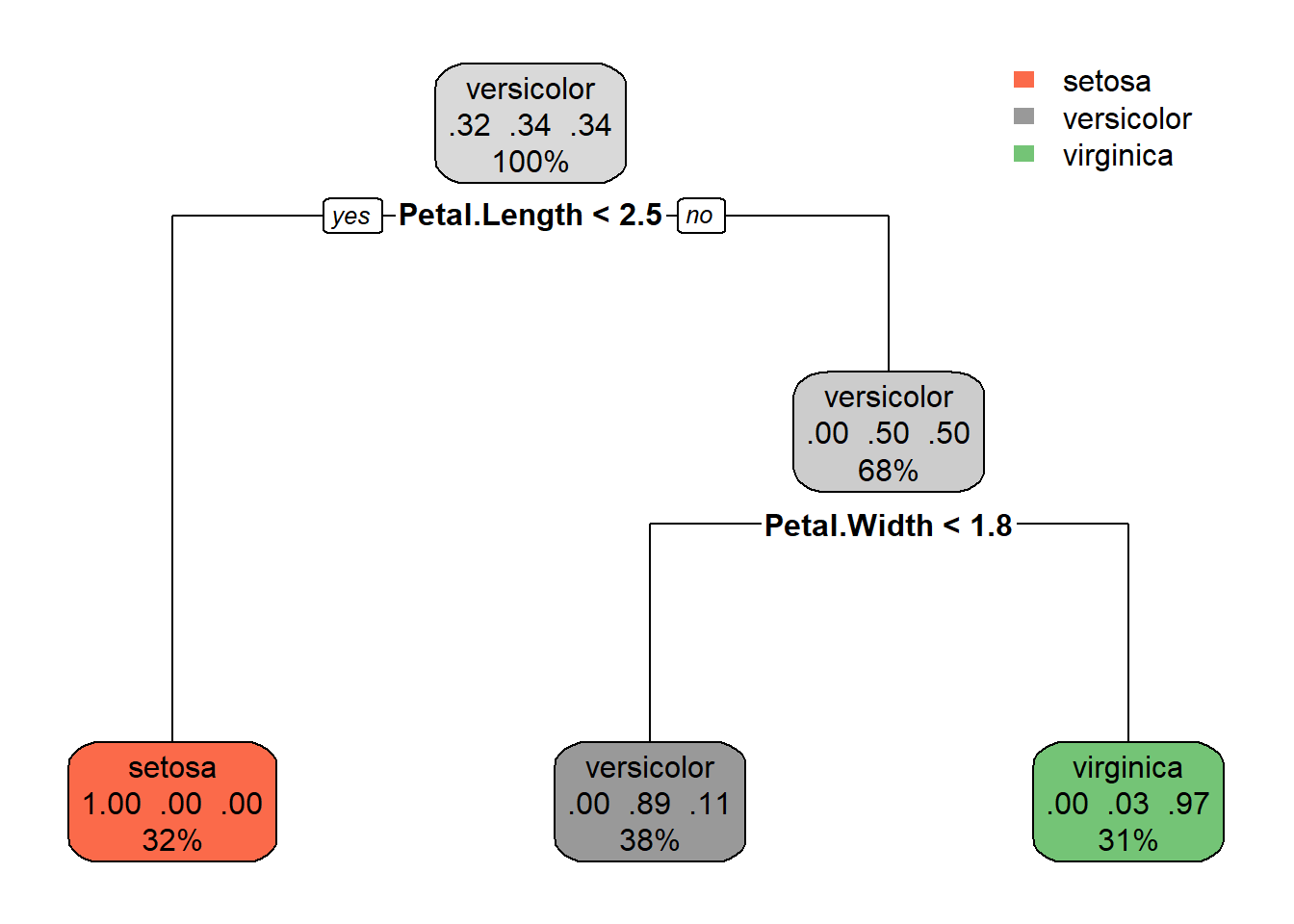 ## Petal.Length < 2.45 to the left, improve=38.95000, (0 missing)
