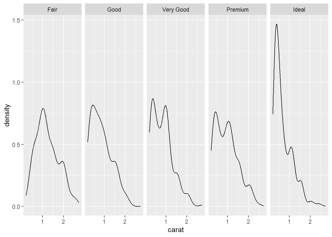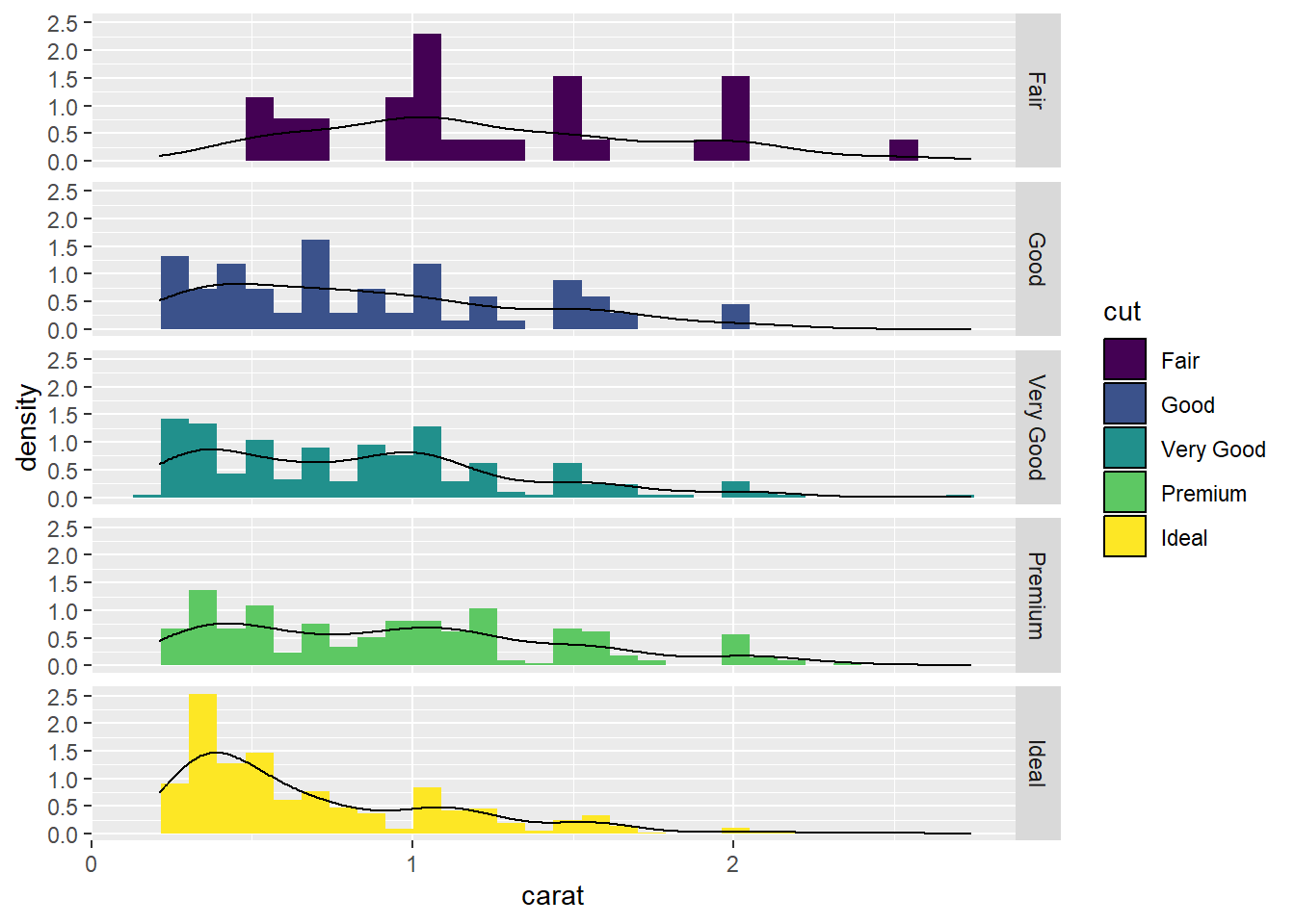 facet_grid(cut ~ .)## Warning: `stat(density)` was deprecated in ggplot2 3.4.0.
