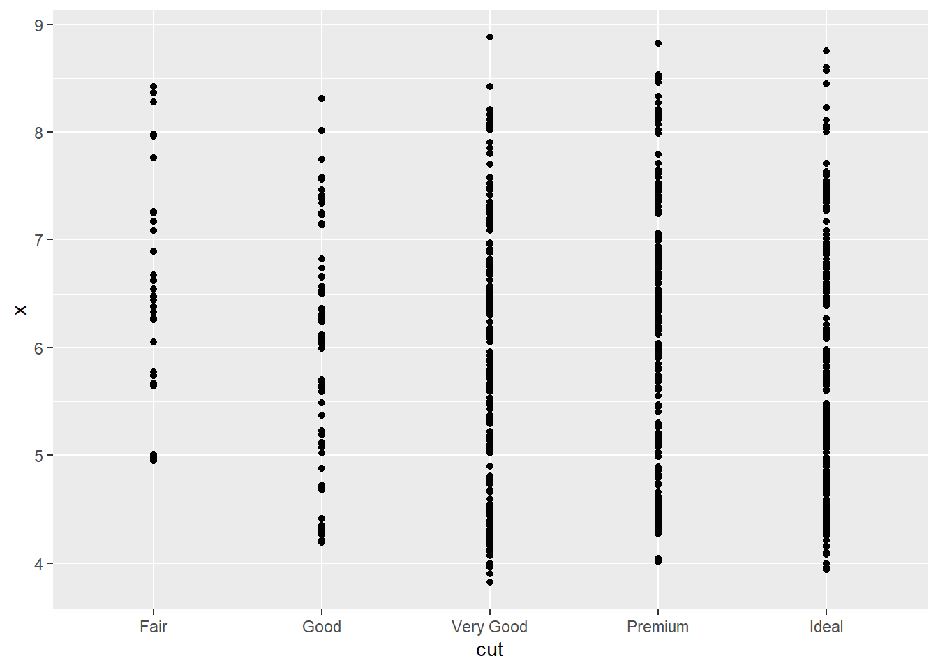 ggplot(data=dsmall,aes(x=cut,y=x))+