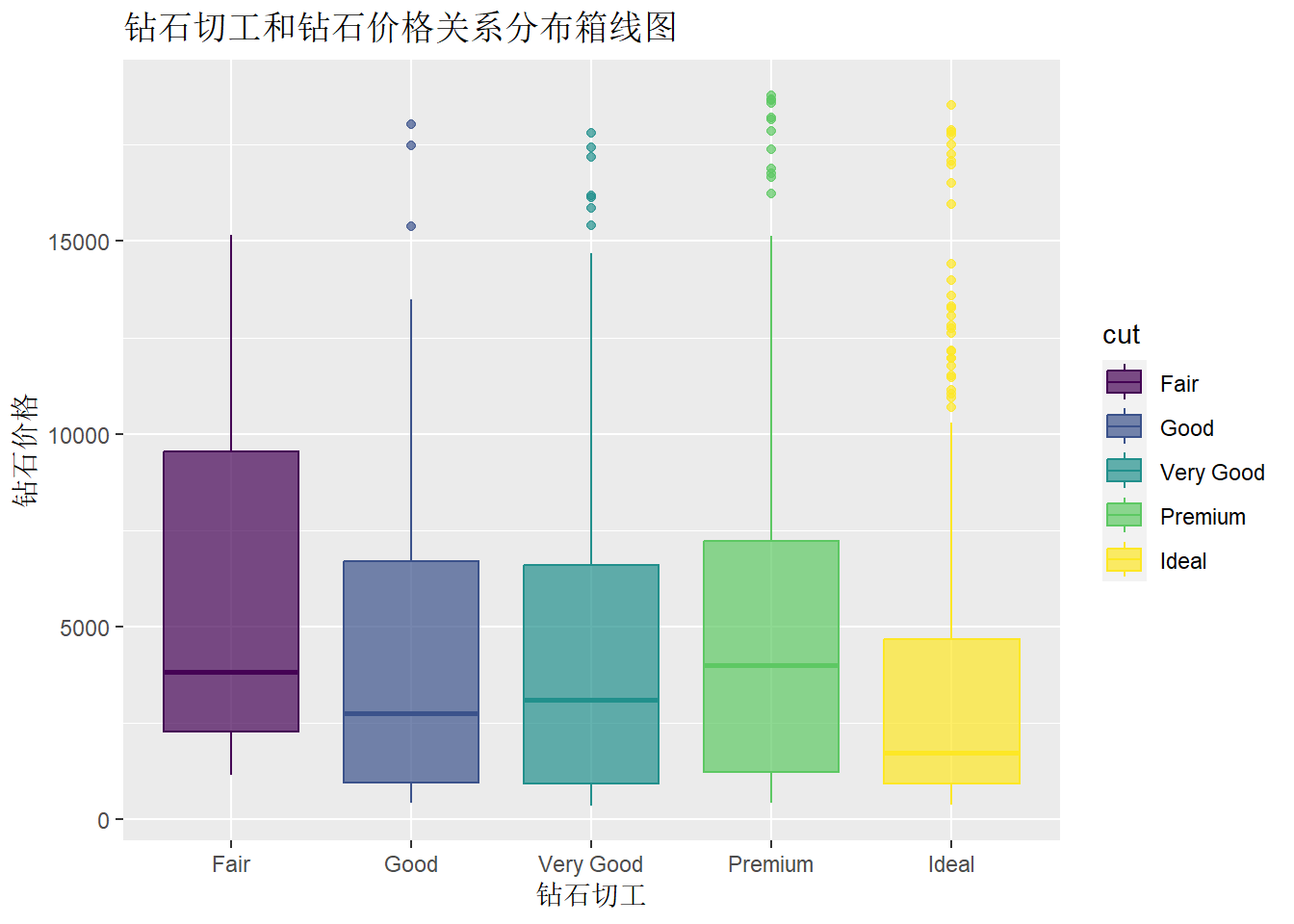 labs(x="钻石切工",y="钻石价格",title="钻石切工和钻石价格关系分布箱线图")