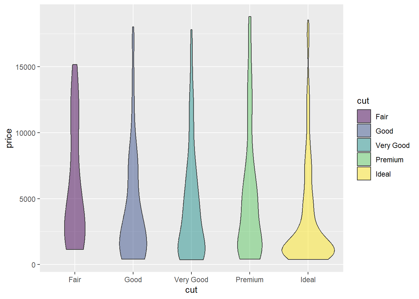 aes(x=cut,y=price,fill=cut,color=cut))+