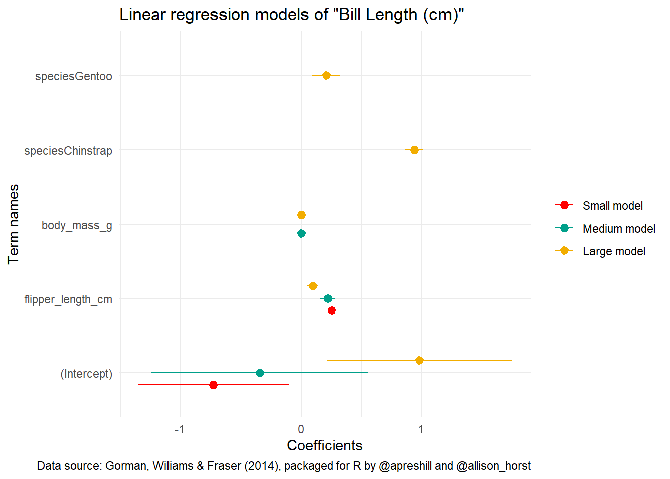 "Medium model" = lm(bill_length_cm ~ flipper_length_cm + body_mass_g, data = dat),