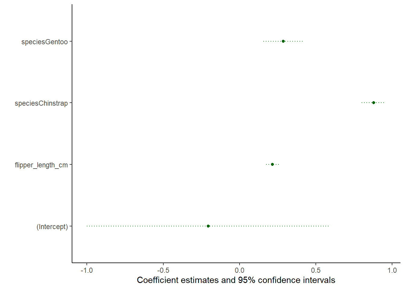 modelplot(mod, size = 1, fatten = .7, color = 'darkgreen', linetype = 'dotted') +
