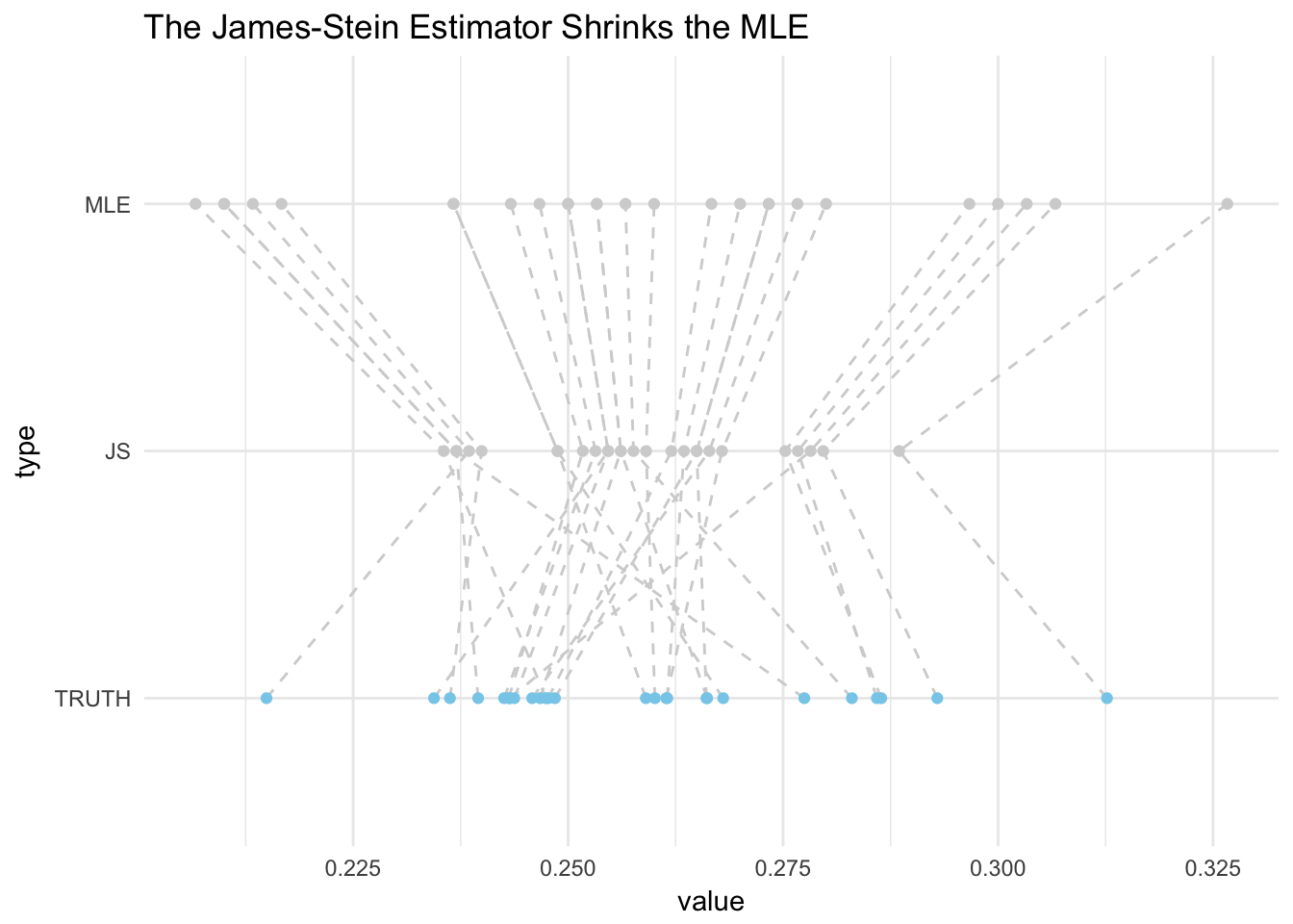 labs(title="The James-Stein Estimator Shrinks the MLE")+
