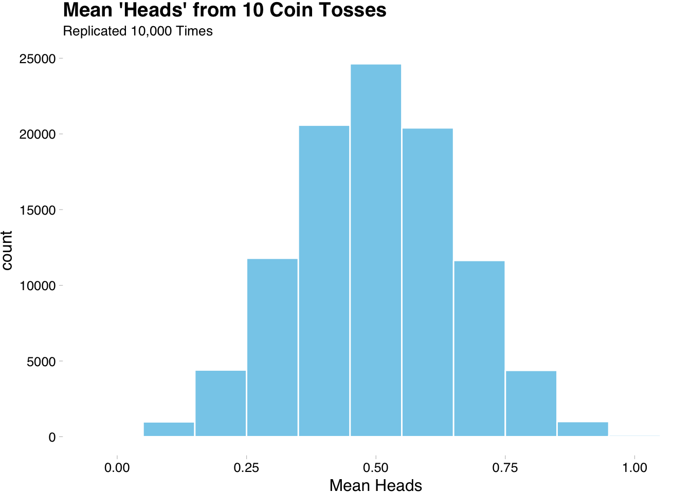 Before introducing the crossing() function lets set up a simple ,albiet cliche, coin flipping experiment. We flip a coin 10 times and observe the average. Here our random variable is distributed as