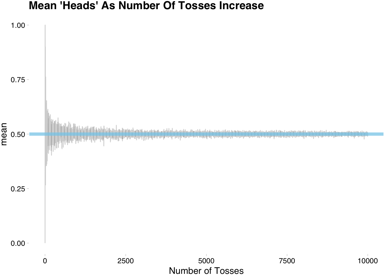 The above plot shows that the more tosses we do the closer we get to the expected value. This somewhat trivial for the coin flipping example, but when testing unfamiliar methods/estimates the technique of simulating replications comes in handy. If this is unfamiliar go ahead and repeat the above code and play with different distributions.