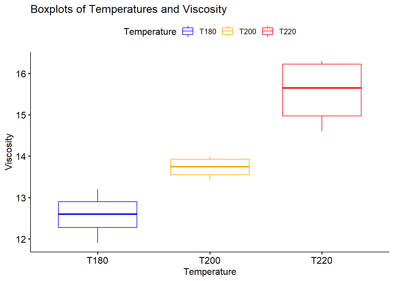 value.name = "Viscosity")We can then run a comparative boxplots chart to see how these three data sets look compared to each other in terms of central tendency and spread.