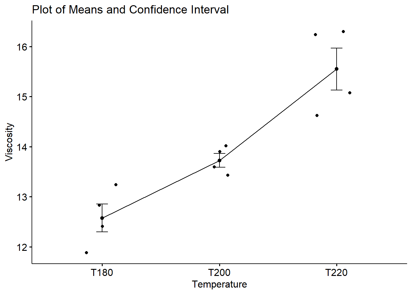 Notice that the p-value (Pr(>F)) of 0.000212 is lower than the alpha risk of 0.05. In this example, we reject the Null Hypothesis and conclude that temperature affects the response variable viscosity.