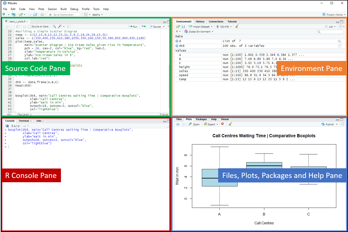 If you have never worked with RStudio before, here’s a quick overview of the four main panes. To make it easy to navigate through these panes, I’ve colour-coded them and will explain each in the next sections.