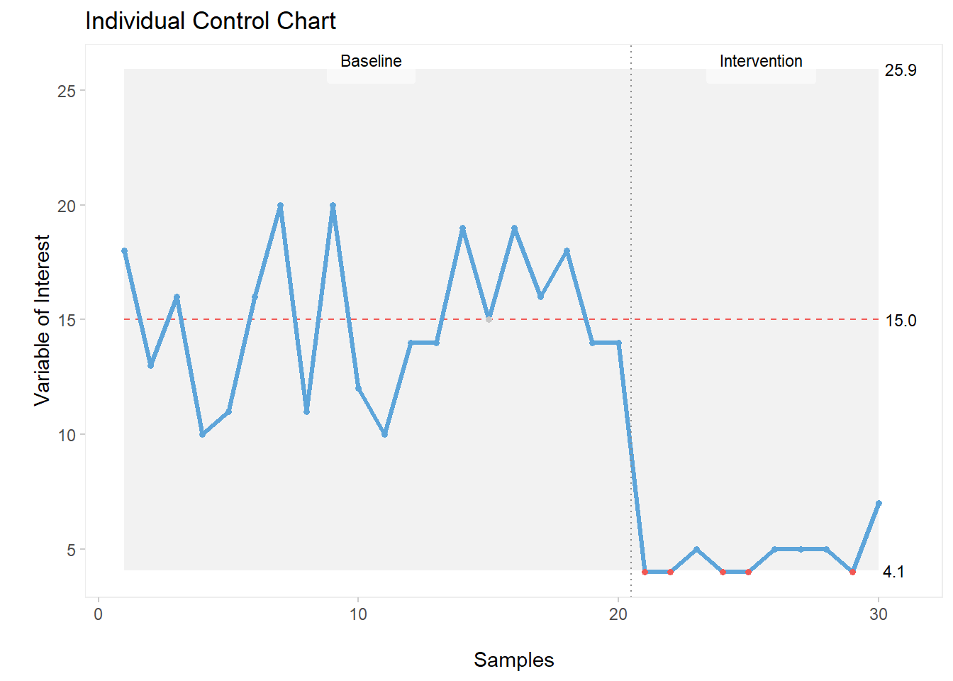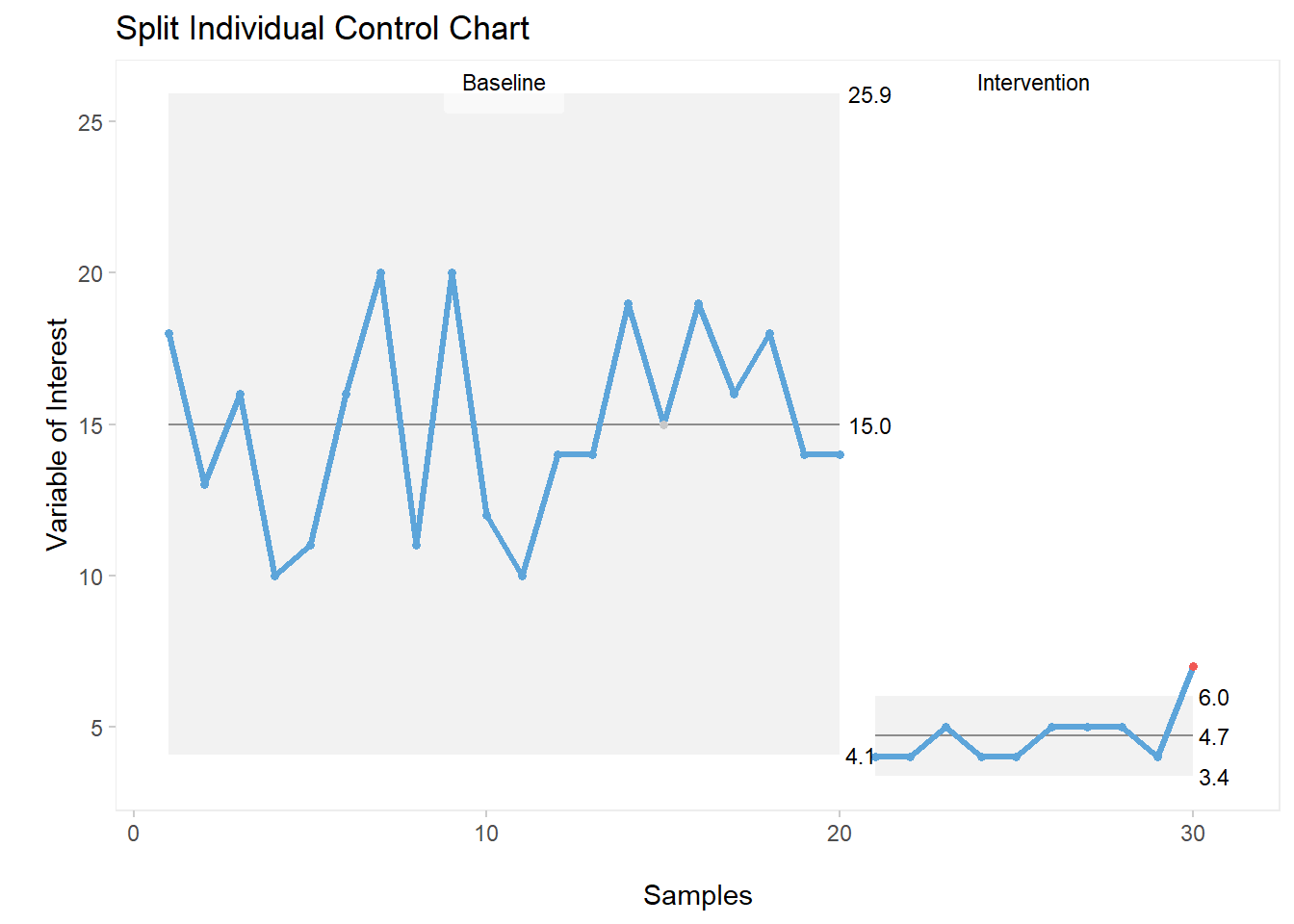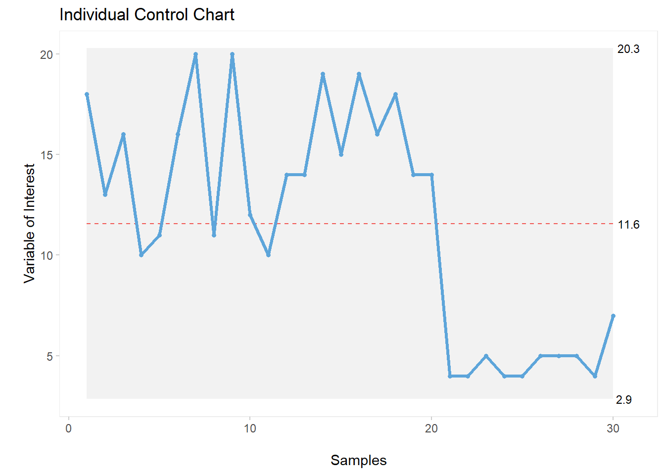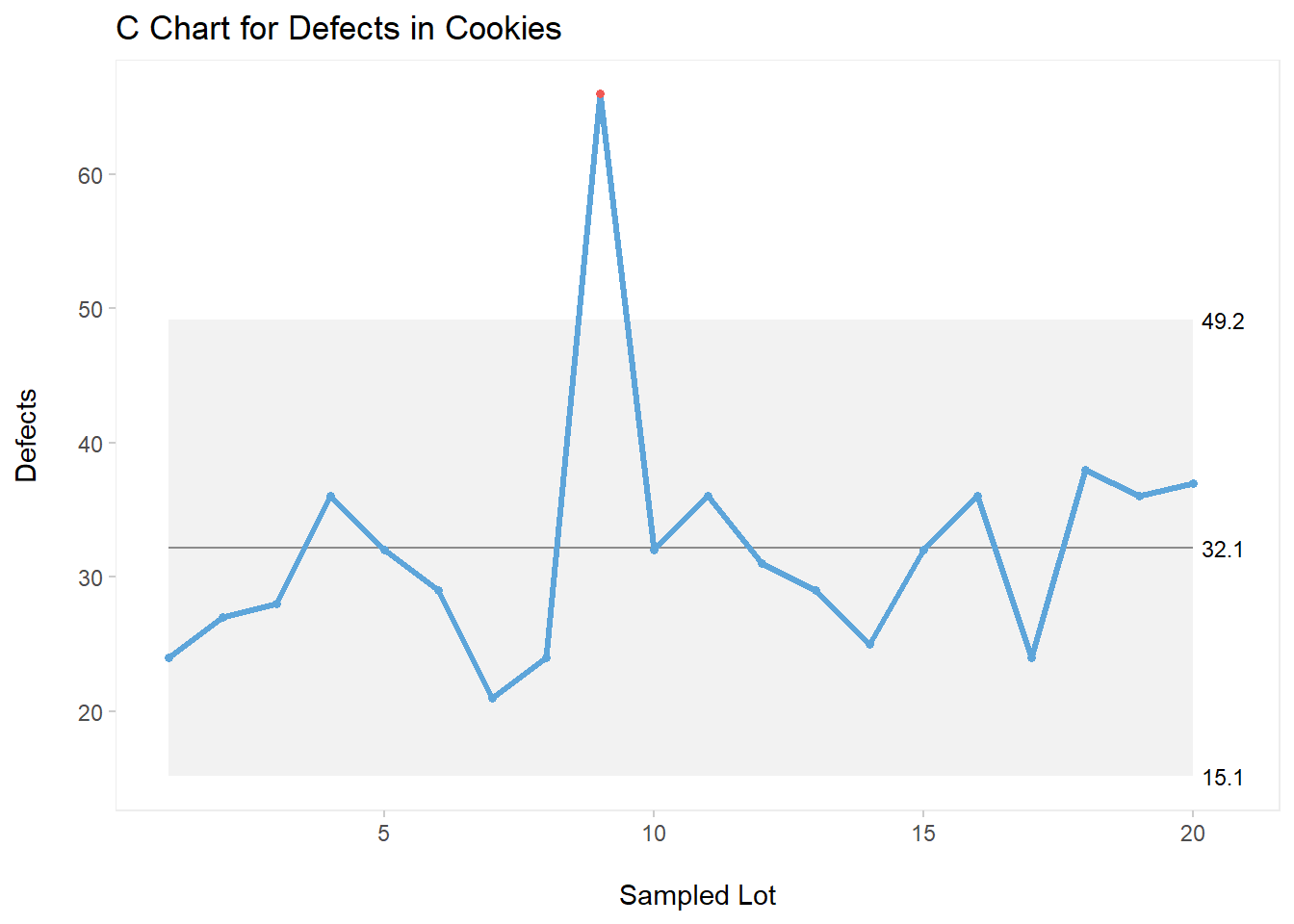 As shown on the above C chart, we can see a special cause of variation half way through our plot (Lot 9).
