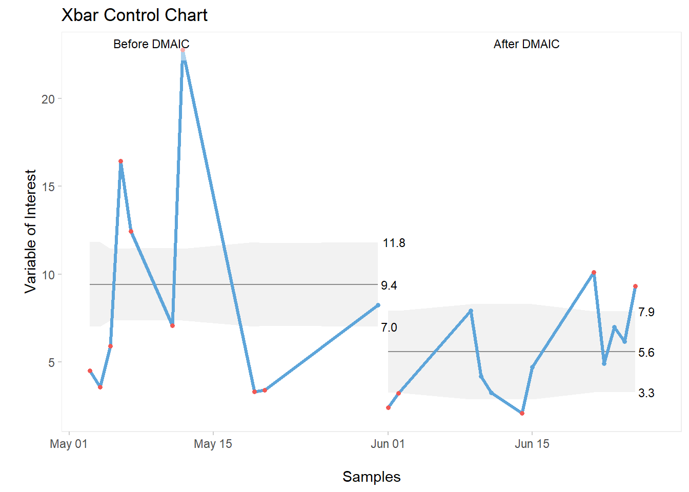 part.labels = c("Before DMAIC", "After DMAIC"),