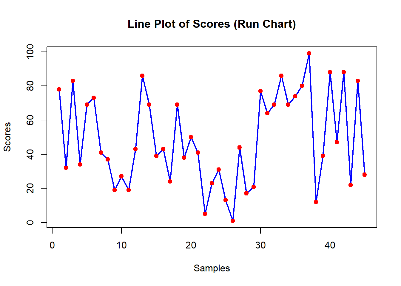 main="Line Plot of Scores (Run Chart)", col="blue",