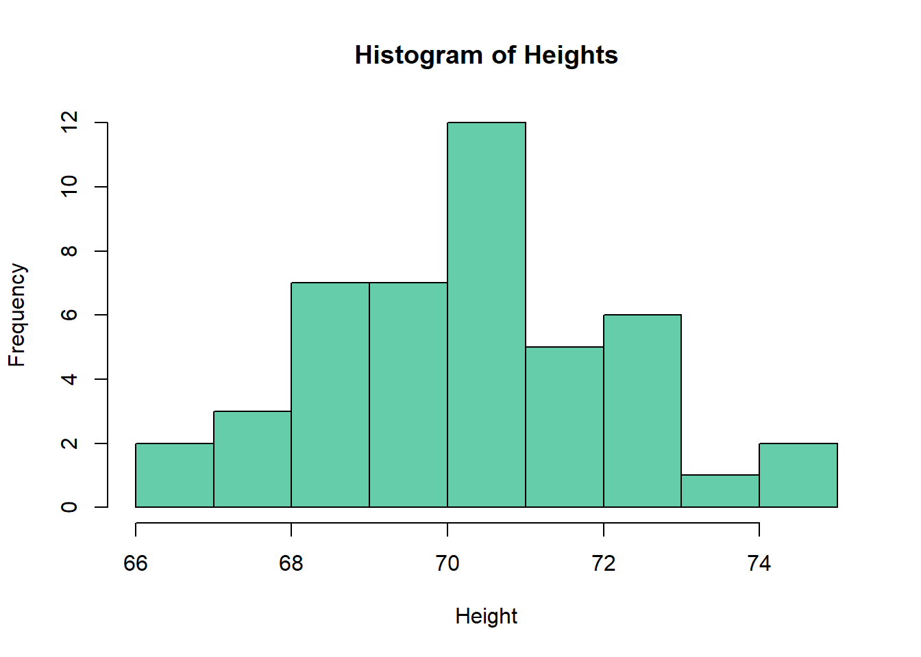 hist(height, main="Histogram of Heights", col="aquamarine3",