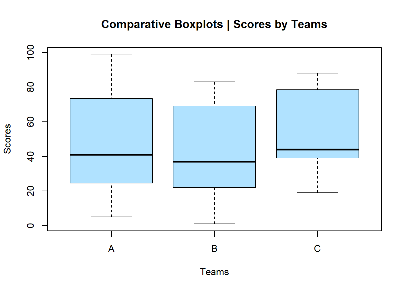 plot(teams,scores, main="Comparative Boxplots | Scores by Teams",