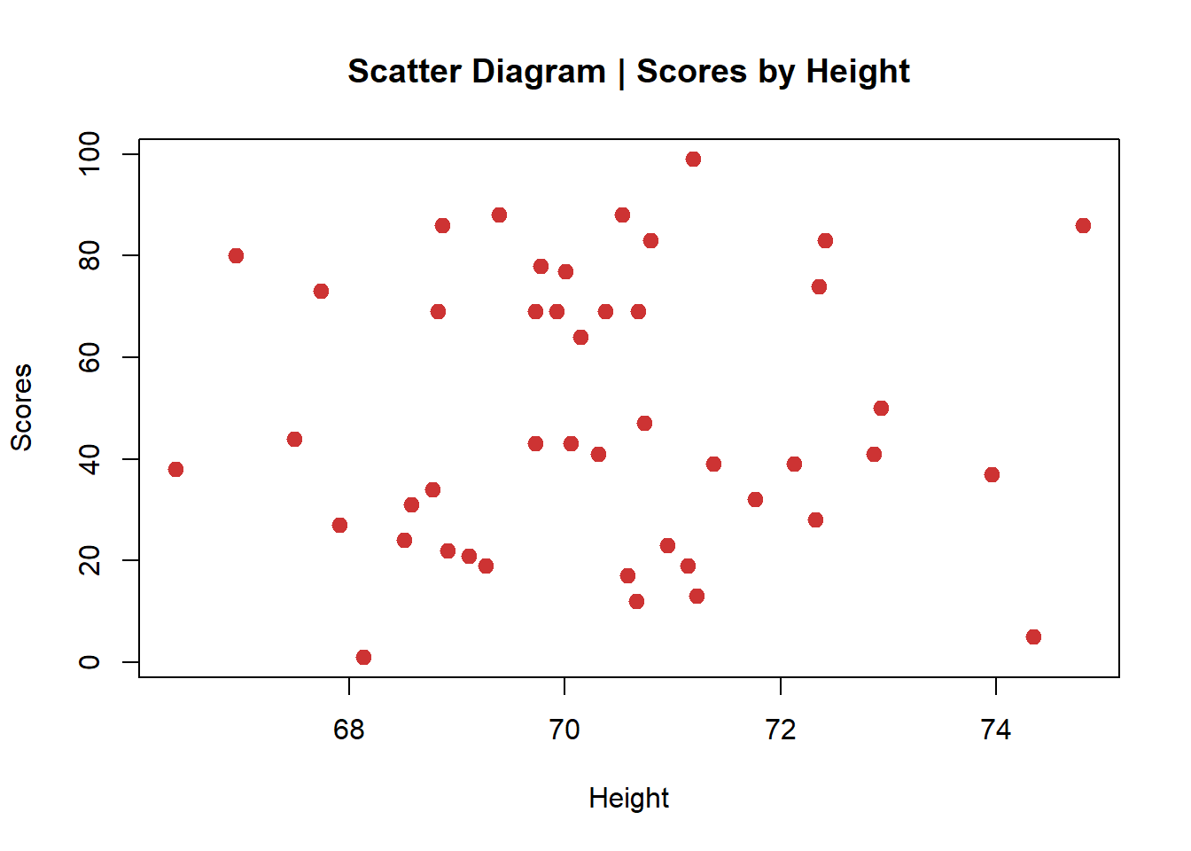 plot(scores~height, main="Scatter Diagram | Scores by Height",