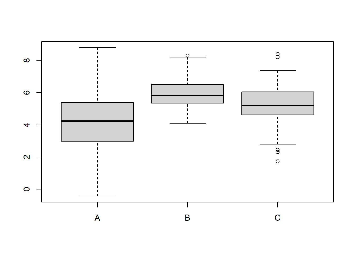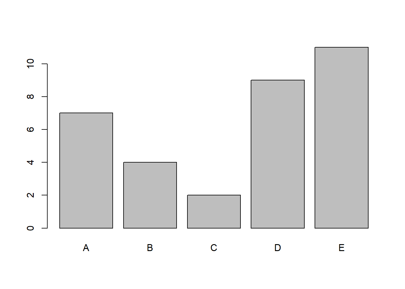 A simple yet very clean bar plot is created. This is the basic standard of a bar plot in R, columns are shaded in grey and contoured by a black solid line.