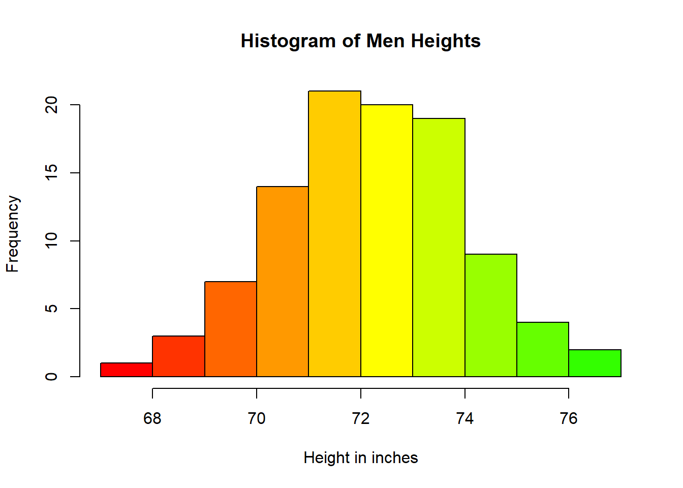 men_height <- rnorm(100,72,2)Notice that I’ve simply stored the data into an object named men_height; this is a random distribution of heights for men. From the function, I’ve asked for 100 data points, a mean of 72 (inches) and a standard deviation of 2 (inches). The rnorm function works with the following syntax: rnorm(sample size, mean, standard deviation). Also, I’ve used the function set.seed so that the data pattern created for this plot is the same as the other histograms in this example.