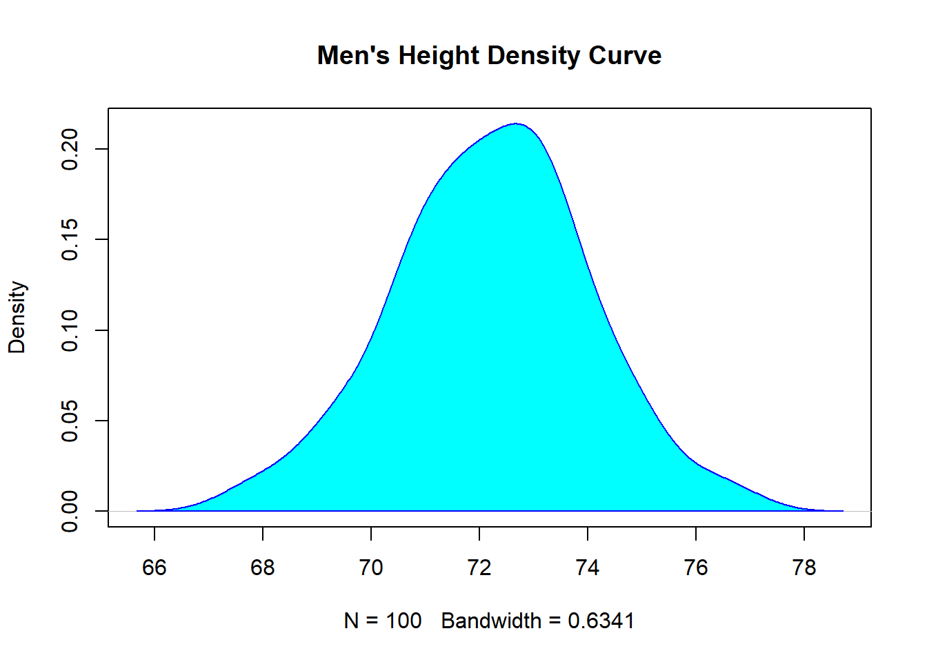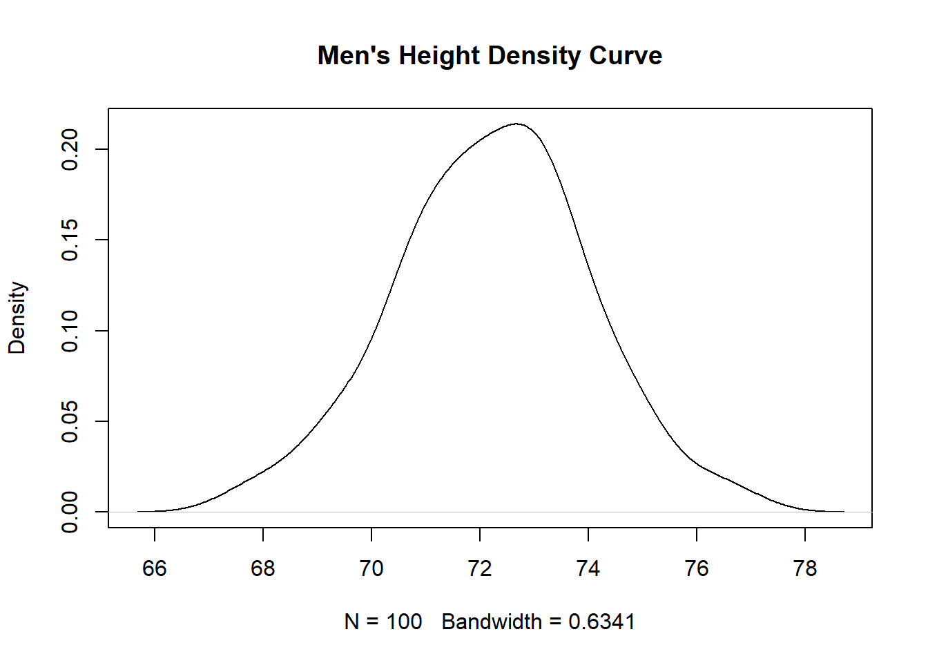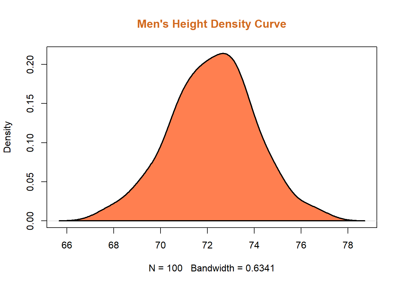 men_height <- rnorm(100,72,2)Then let’s create an object d with the density kernel function, like this: