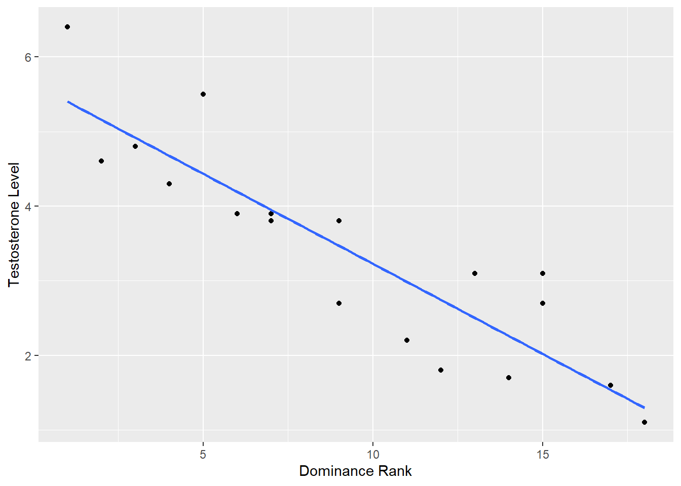 Perhaps with such data you may be interested in seeing if there was an association between dominance rank and testosterone levels. Because your dominance rank measure is ordinal (a rank), then you should pick a non-parametric correlation.