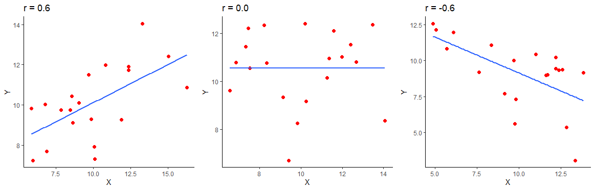 The below image shows a positive correlation of \(r=0.6\), a zero correlation of \(r=0\) and a negative correlation of \(r=-0.6\) for 20 datapoints in each scatterplot.