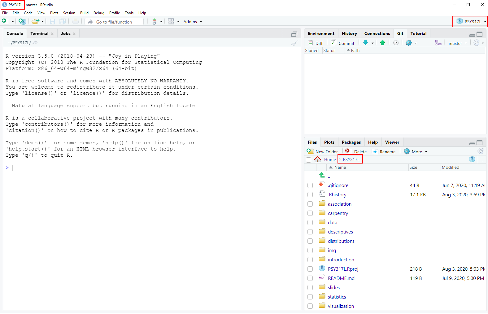 For our course, the best way to access the R files is to hit the blue Rproject icon PSY317L. Once you click that, RStudio should automatically open and you should see something like this: